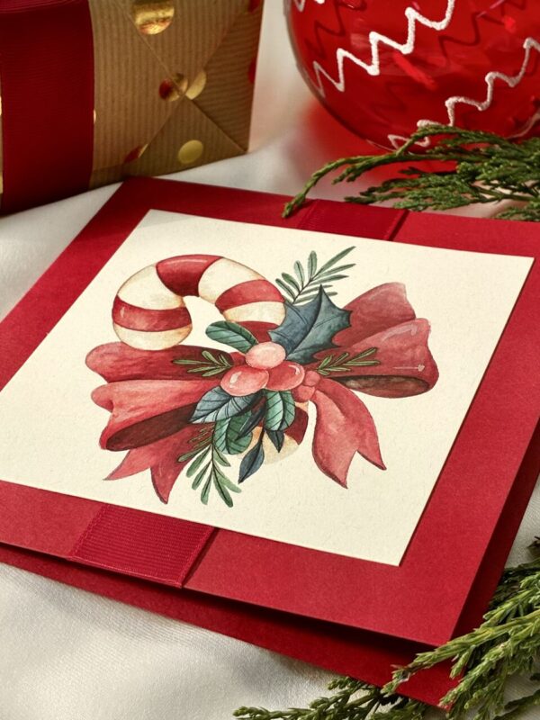 Kartka świąteczna z cukrową laską i czerwono-zieloną kompozycją to elegancka propozycja dla osób, które kochają klasyczne świąteczne motywy. Intensywna czerwień, akwarelowe zdobienia i solidny papier premium sprawiają, że kartka wygląda wyjątkowo efektownie. Idealna do prezentu, życzeń i świątecznych upominków. W zestawie dopasowana koperta. Specyfikacja – format 134 x 134 mm, możliwość zmiany formatu kartki– wysokiej jakości papier o gramaturze min. 250 g– koperta biała lub ecru w komplecie
