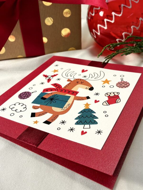 Kartka świąteczna z uroczym reniferem w zimowym klimacie – pełna radości, kolorów i świątecznej energii. Idealna dla dzieci i dorosłych, którzy kochają lekkie, zabawne wzory. Druk na papierze premium i elegancka, połyskująca czerwona ramka sprawiają, że kartka prezentuje się wyjątkowo. W zestawie dopasowana koperta. Specyfikacja – format 134 x 134 mm, możliwość zmiany formatu kartki– wysokiej jakości papier o gramaturze min. 250 g– koperta biała lub ecru w komplecie