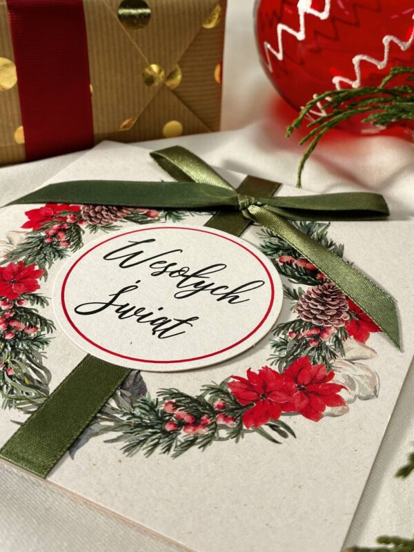 Kartka świąteczna z eleganckim wieńcem i napisem „Wesołych Świąt”, ozdobiona satynową zieloną kokardą. Klasyczna, efektowna i pełna świątecznego uroku. Druk na papierze premium podkreśla jakość i dbałość o detale. Idealna do prezentów i świątecznych życzeń. W zestawie dopasowana koperta. Specyfikacja – format 134 x 134 mm, możliwość zmiany formatu kartki– wysokiej jakości papier o gramaturze min. 250 g– koperta biała lub ecru w komplecie