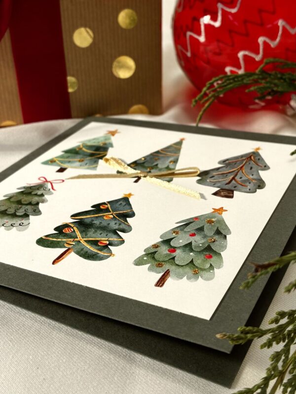 Kartka świąteczna z ilustracją sześciu uroczych choinek – każda w innym, wyjątkowym stylu. Lekka, radosna i pełna świątecznego klimatu. Złota kokardka dodaje elegancji, a papier premium podkreśla wysoką jakość wykonania. Idealna do prezentów, życzeń i świątecznych paczek. W zestawie dopasowana koperta. Specyfikacja – format 134 x 134 mm, możliwość zmiany formatu kartki– wysokiej jakości papier o gramaturze min. 250 g– koperta biała lub ecru w komplecie