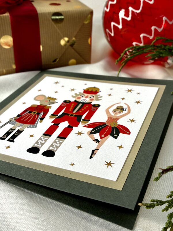Kartka świąteczna inspirowana klasycznym „Dziadkiem do orzechów” – z eleganckimi postaciami i złotymi akcentami. Stylowa, teatralna i pełna świątecznego uroku. Druk na papierze premium oraz ozdobna ramka podkreślają jej wyjątkowy charakter. Idealna do prezentów, życzeń i świątecznych upominków. W zestawie dopasowana koperta. Specyfikacja – format 134 x 134 mm, możliwość zmiany formatu kartki– wysokiej jakości papier o gramaturze min. 250 g– koperta biała lub ecru w komplecie