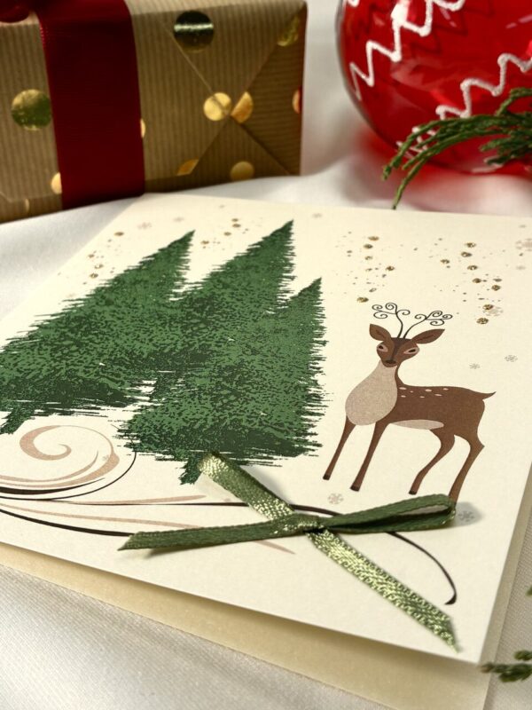 Kartka świąteczna z lasem zimowych świerków i uroczym jelonkiem. Subtelne złote akcenty i zielona kokardka dodają jej elegancji i świątecznego charakteru. Idealna do prezentów, życzeń i rodzinnych upominków. Druk na papierze premium podkreśla wysoką jakość. W zestawie dopasowana koperta. Specyfikacja – format 134 x 134 mm, możliwość zmiany formatu kartki– wysokiej jakości papier o gramaturze min. 250 g– koperta biała lub ecru w komplecie