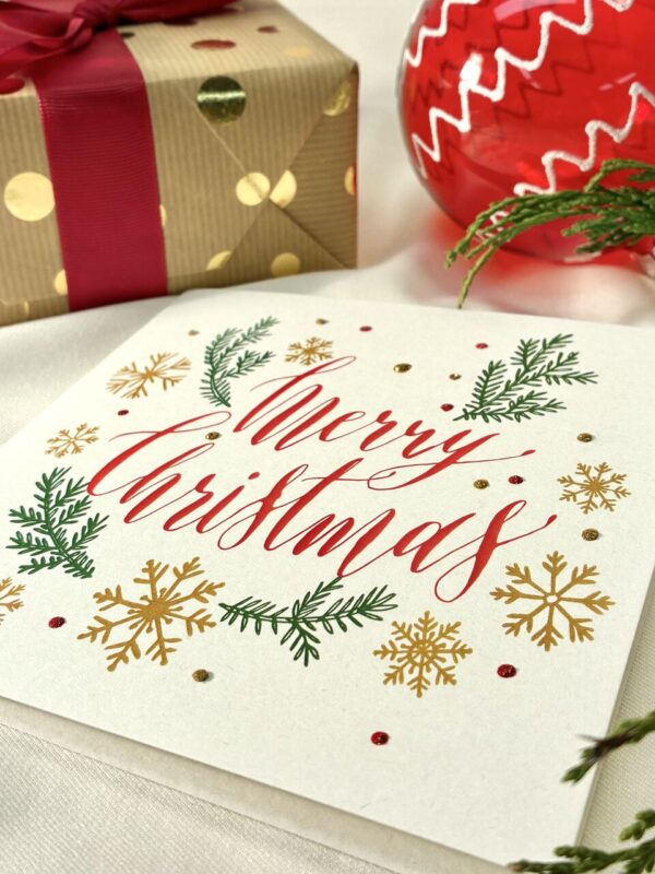 Kartka świąteczna Merry Christmas z elegancką typografią, złotymi śnieżynkami i zielonymi gałązkami. Klasyczna, efektowna i pełna świątecznego blasku. Druk na papierze premium podkreśla wysoką jakość i dbałość o detale. Idealna do prezentów, życzeń i świątecznych upominków. W zestawie dopasowana koperta. Specyfikacja – format 134 x 134 mm, możliwość zmiany formatu kartki– wysokiej jakości papier o gramaturze min. 250 g– koperta biała lub ecru w komplecie