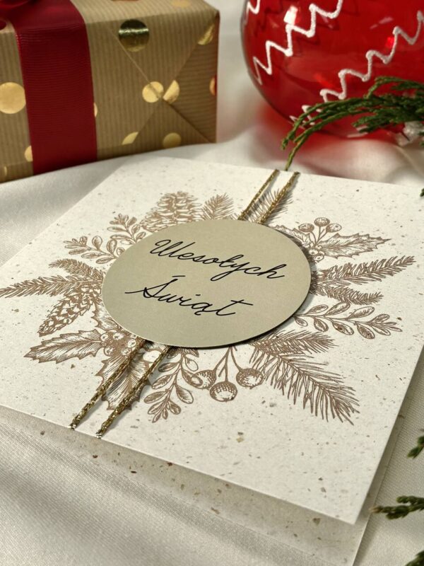Kartka świąteczna z delikatnym, złotobrązowym wieńcem i medalionem „Wesołych Świąt”. Subtelna, klasyczna i bardzo stylowa – idealna dla osób, które lubią stonowane, naturalne motywy. Papier premium i złote detale nadają jej wyjątkowo elegancki charakter. Doskonała do prezentów i świątecznych życzeń. W zestawie dopasowana koperta. Specyfikacja – format 134 x 134 mm, możliwość zmiany formatu kartki– wysokiej jakości papier o gramaturze min. 250 g– koperta biała lub ecru w komplecie