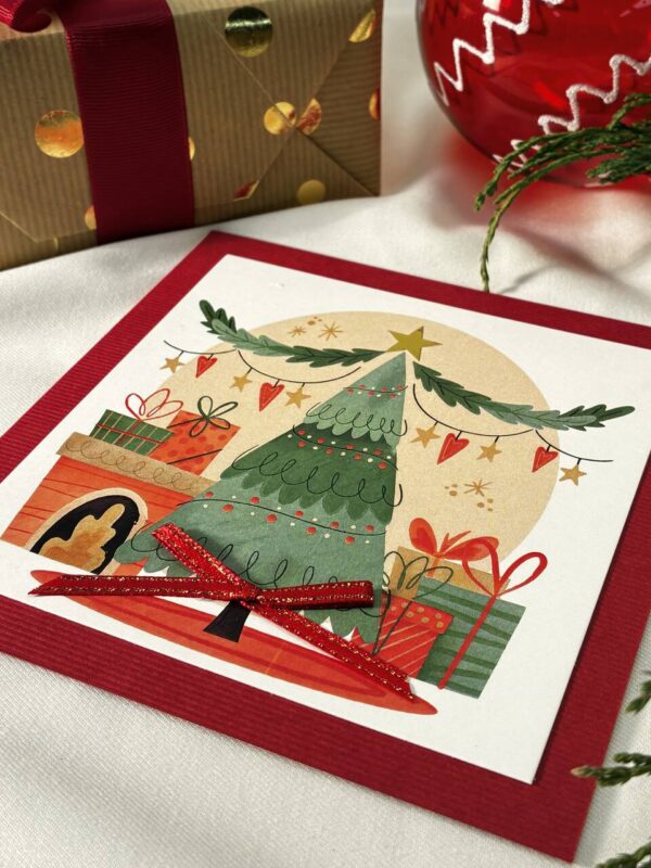 Kartka świąteczna z choinką i prezentami to klasyczny, pełen ciepła motyw, który od razu wprowadza w świąteczny nastrój. Ilustracja w odcieniach czerwieni i zieleni pięknie komponuje się z elegancką czerwoną ramką. Idealna do życzeń, prezentów i firmowych upominków. Druk na papierze premium. W zestawie dopasowana koperta. Specyfikacja – format 134 x 134 mm, możliwość zmiany formatu kartki– wysokiej jakości papier o gramaturze min. 250 g– koperta biała lub ecru w komplecie