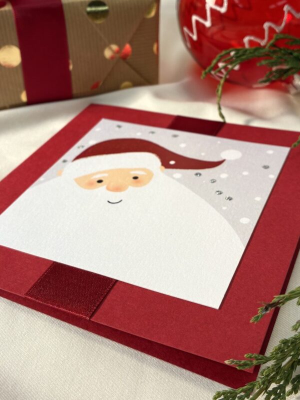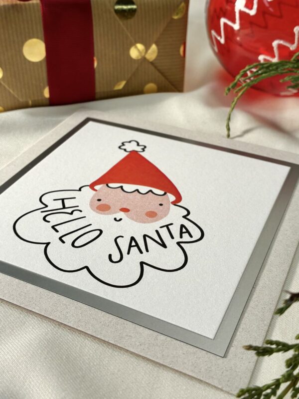Kartka świąteczna z uroczym Mikołajem i napisem Hello Santa. Prosty, nowoczesny wzór, który wywołuje uśmiech od razu po otwarciu. Idealna do prezentów, życzeń i świątecznych paczek. Druk na wysokiej jakości papierze z elegancką ramką nadaje jej premium charakter. W zestawie dopasowana koperta. Specyfikacja – format 134 x 134 mm, możliwość zmiany formatu kartki– wysokiej jakości papier o gramaturze min. 250 g– koperta biała lub ecru w komplecie