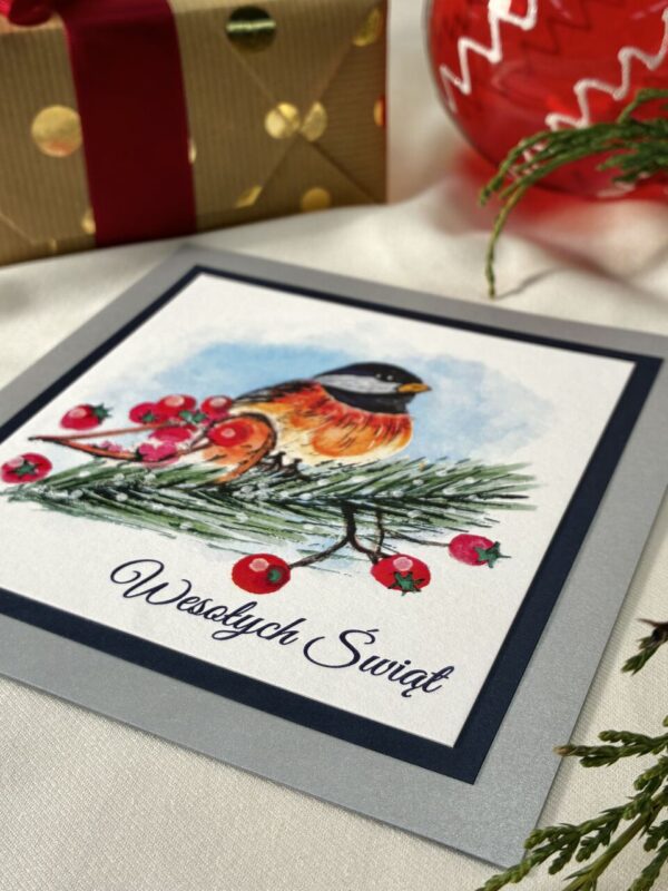 Kartka świąteczna z akwarelowym ptaszkiem – elegancka i pełna świątecznego ciepła. Idealna do wysłania życzeń lub jako dodatek do prezentu. Wysokiej jakości papier, piękne kolory i delikatny zimowy motyw sprawiają, że to wyjątkowa kartka na Boże Narodzenie. W zestawie dopasowana koperta. Specyfikacja – format 134 x 134 mm– wysokiej jakości papier o gramaturze min. 250 g– koperta biała lub ecru w komplecie