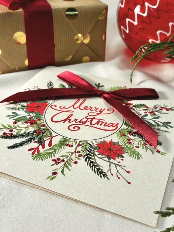 Kartka świąteczna Merry Christmas z piękną, florystyczną kompozycją i satynową czerwoną kokardą. Wyjątkowo efektowna, idealna jako dodatek do prezentu lub do wysłania świątecznych życzeń. Drukowana na papierze premium, wyróżnia się jakością i świątecznym charakterem. W zestawie dopasowana koperta. Specyfikacja – format 134 x 134 mm, możliwość zmiany formatu kartki– wysokiej jakości papier o gramaturze min. 250 g– koperta biała lub ecru w komplecie