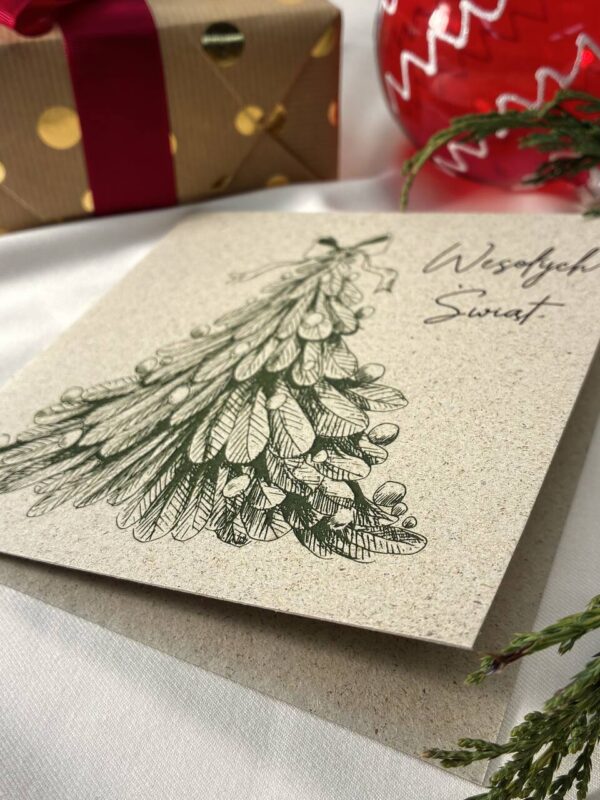 Kartka świąteczna z rysunkową choinką w minimalistycznym stylu. Subtelna ilustracja na naturalnym papierze tworzy efekt klasy i spokoju – idealna dla osób, które lubią prostotę i elegancję. Pięknie sprawdzi się do świątecznych życzeń, prezentów i firmowych upominków. W zestawie dopasowana koperta. Specyfikacja – format 134 x 134 mm, możliwość zmiany formatu kartki– wysokiej jakości papier o gramaturze min. 250 g– koperta biała lub ecru w komplecie
