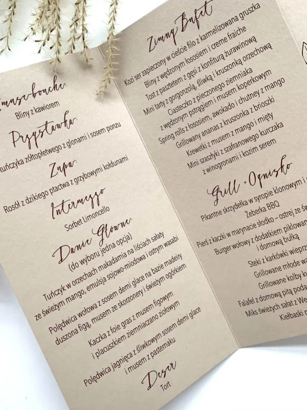 Klasyczne menu weselne w eleganckim odcieniu nude, wykonane na wysokiej jakości papierze o gramaturze 250 g. Otwierana forma i minimalistyczny, roślinny motyw nadają mu ponadczasowego charakteru i delikatnej elegancji. To menu idealnie pasuje do przyjęć w stylu klasycznym, rustykalnym lub nowoczesnym minimalistycznym. Subtelny beżowo-piaskowy odcień tworzy harmonijne tło dla kaligraficznego napisu i prostego rysunku liści. Każdy egzemplarz może zostać spersonalizowany — od koloru papieru, przez nadruk, aż po szczegóły treści. Dzięki temu menu pięknie komponuje się z pozostałymi elementami papeterii ślubnej, tworząc spójną, elegancką całość. Specyfikacja – format: 21 × 10,5 cm (po złożeniu)– papier: wysokiej jakości 250 g– kolor: nude / piaskowy beż– minimalistyczny motyw roślinny– otwierana forma– możliwość personalizacji i zmiany kolorystyki