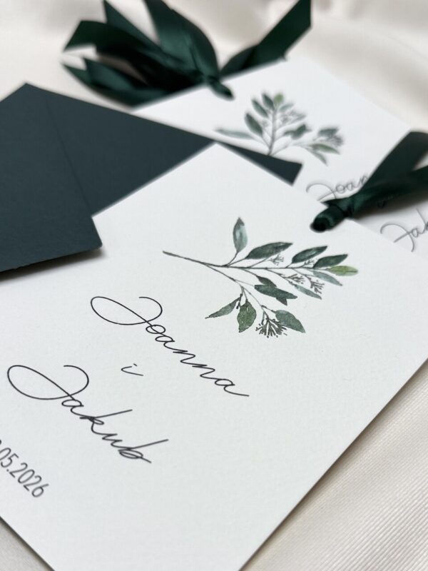 Delikatne, botaniczne zaproszenie ślubne utrzymane w eleganckiej, leśnej kolorystyce. Biel pięknie kontrastuje z ciemnozieloną kopertą i satynową wstążką, a akwarelowa gałązka dodaje całości lekkości i naturalnego uroku. To idealny wybór dla par, które cenią subtelność, nowoczesną prostotę i motywy inspirowane naturą. W cenie: zaproszenie w formacie 105x148mm o gramaturze 250g koperta biała lub ecru o gramaturze 120g projekt zaproszenia Zawiadomienie: jednostronne (6,00zł) 3 kartkowe (9,00zł) ⭑ Prezentowany wzór jest niezwykle uniwersalny! Może zostać swobodnie dostosowany do każdej innej liczby urodzinowej, a także do zupełnie innej okoliczności czy jubileuszu. Istnieje również możliwość zmiany kolorystyki całego projektu. ⭑ Przy zamówieniach poniżej 20 szt. doliczana jest dopłata 30 zł do całości zamówienia.