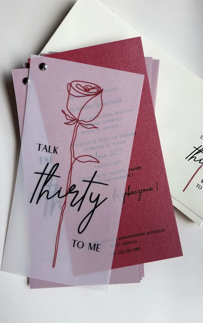 Stylowe zaproszenie w kobiecym, nowoczesnym klimacie – idealne na trzydzieste urodziny. Projekt łączy elegancję i minimalizm: przezroczysty pergamin z delikatnym nadrukiem róży i napisem Talk Thirty To Me subtelnie nakłada się na perłowy papier w odcieniach różu i bordo, tworząc efekt wielowarstwowości i lekkości.