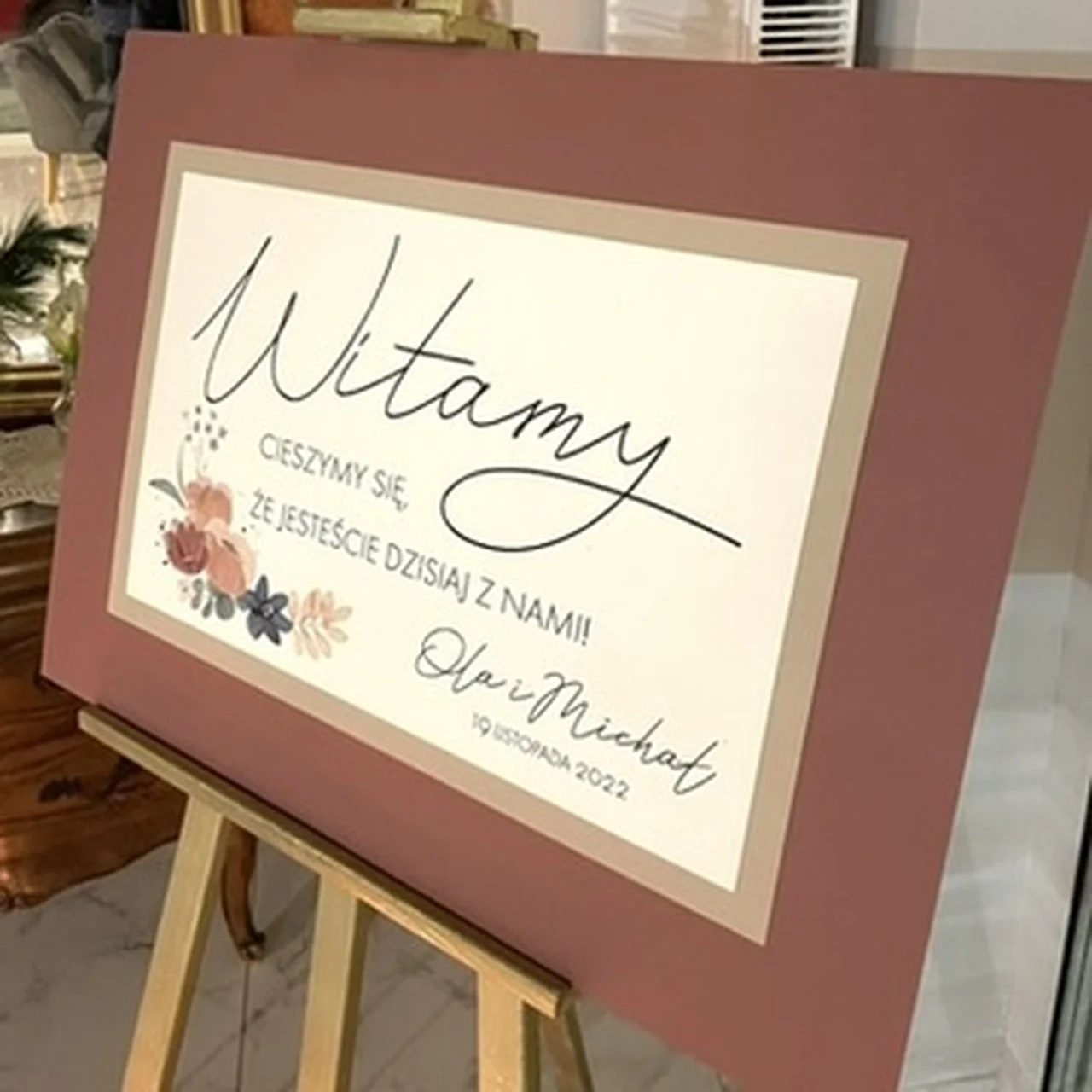 Tablica została wykonana na usztywnionej tekturze introligatorskiej, dzięki czemu nie wymaga ramy – wystarczy postawić ją na sztaludze. Wyrazisty napis „Witamy!” oraz personalizowane imiona i data uroczystości sprawiają, że projekt staje się wyjątkową dekoracją wejścia do sali weselnej.