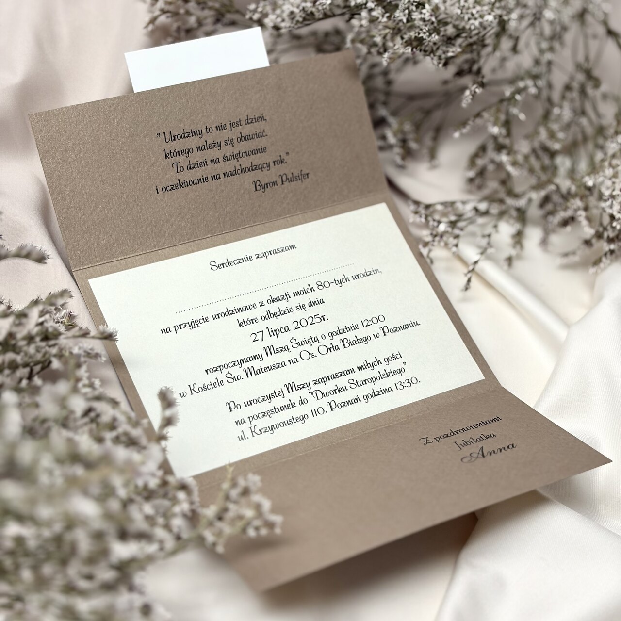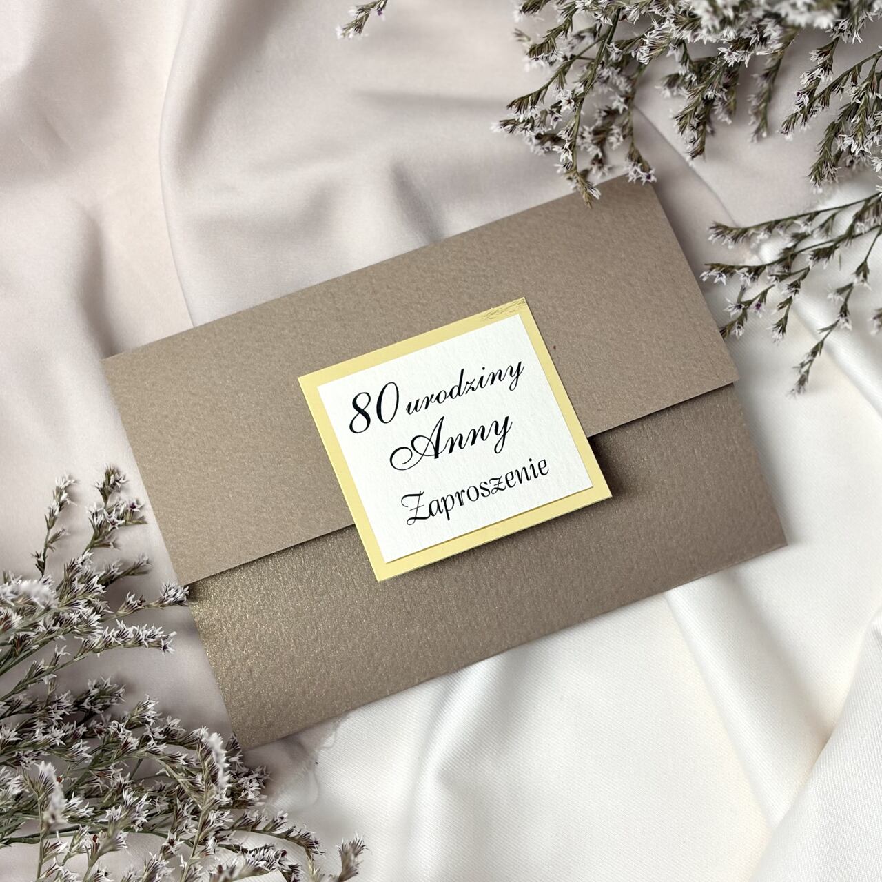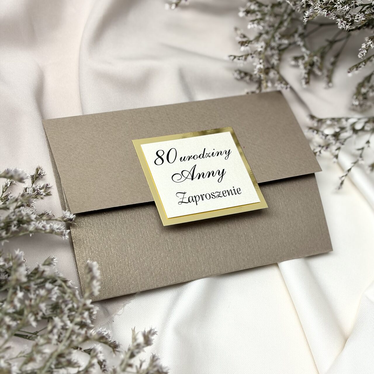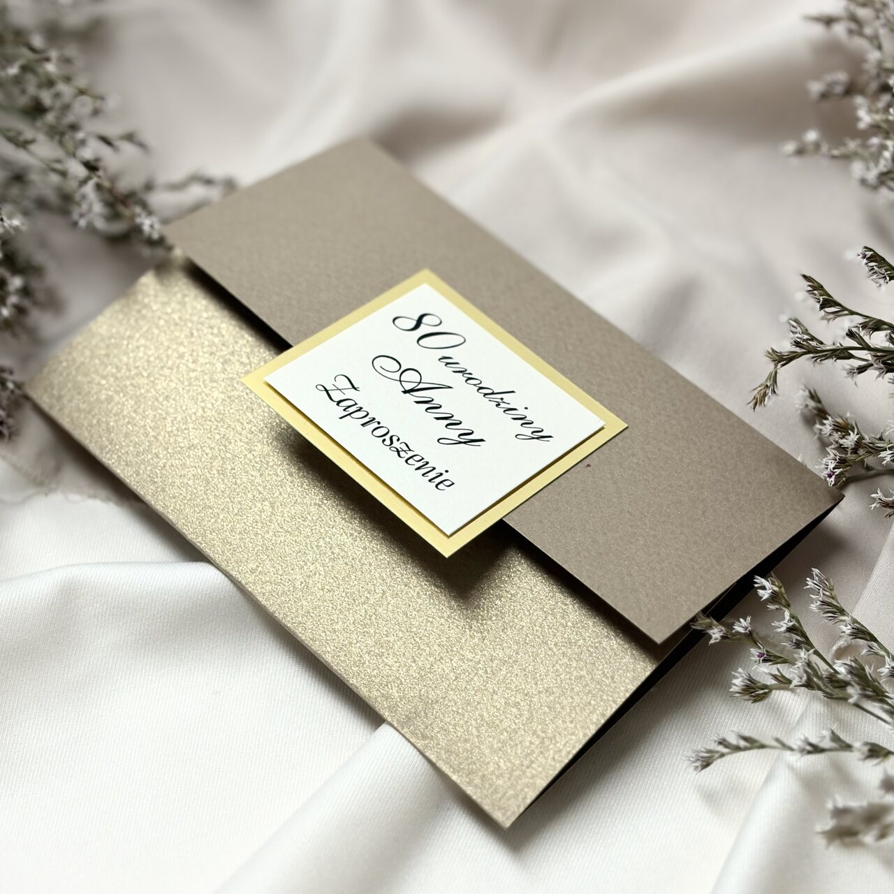 Ponadczasowa elegancja na wyjątkową uroczystość. To zaproszenie wykonane jest z metalizowanego papieru w szlachetnym odcieniu złota, który pięknie mieni się w świetle, nadając całości luksusowego charakteru. Front zdobi stylowa, warstwowa etykieta z imieniem, która idealnie komponuje się z bazą. To klasyczny, dostojny wzór, idealny by podkreślić wagę pięknego jubileuszu.