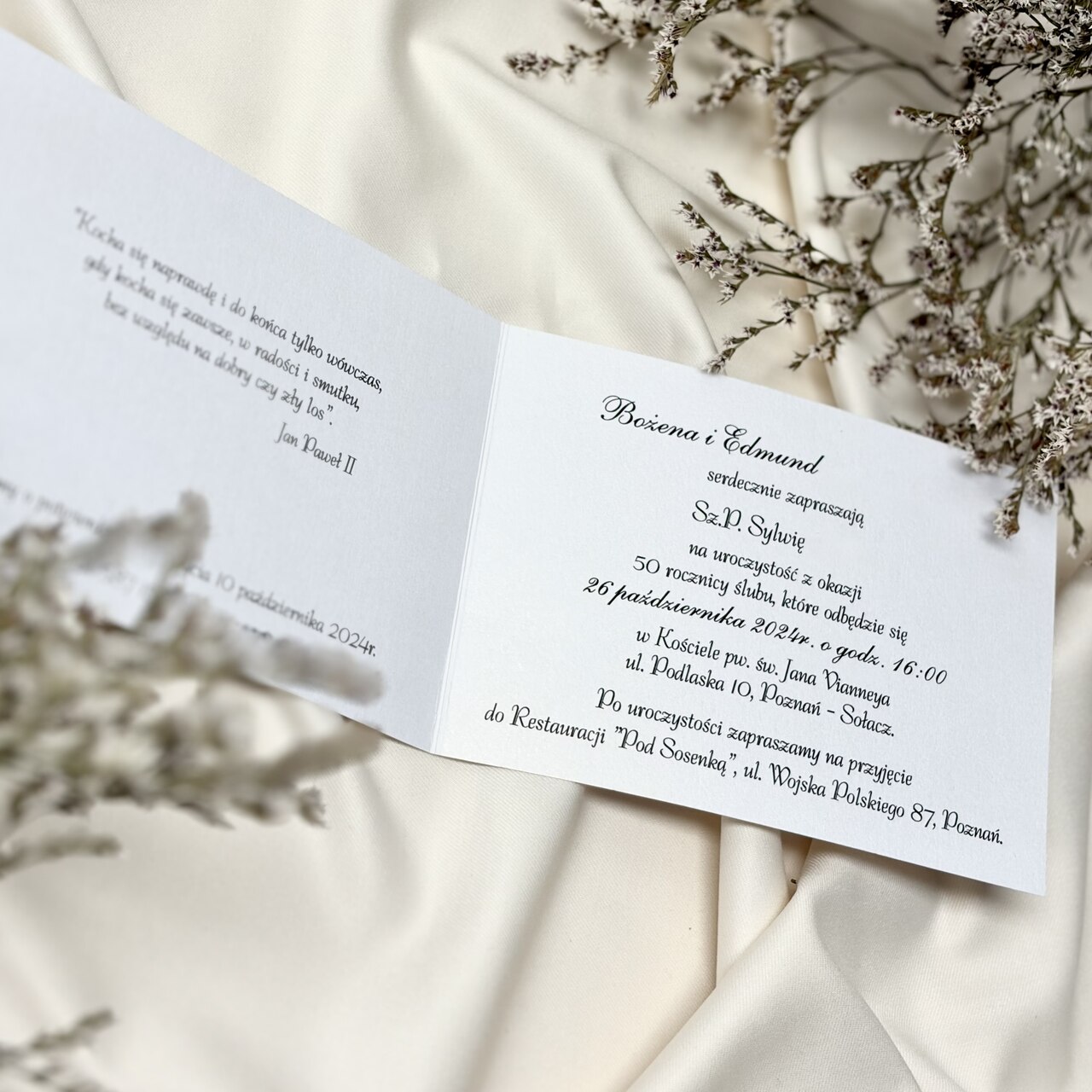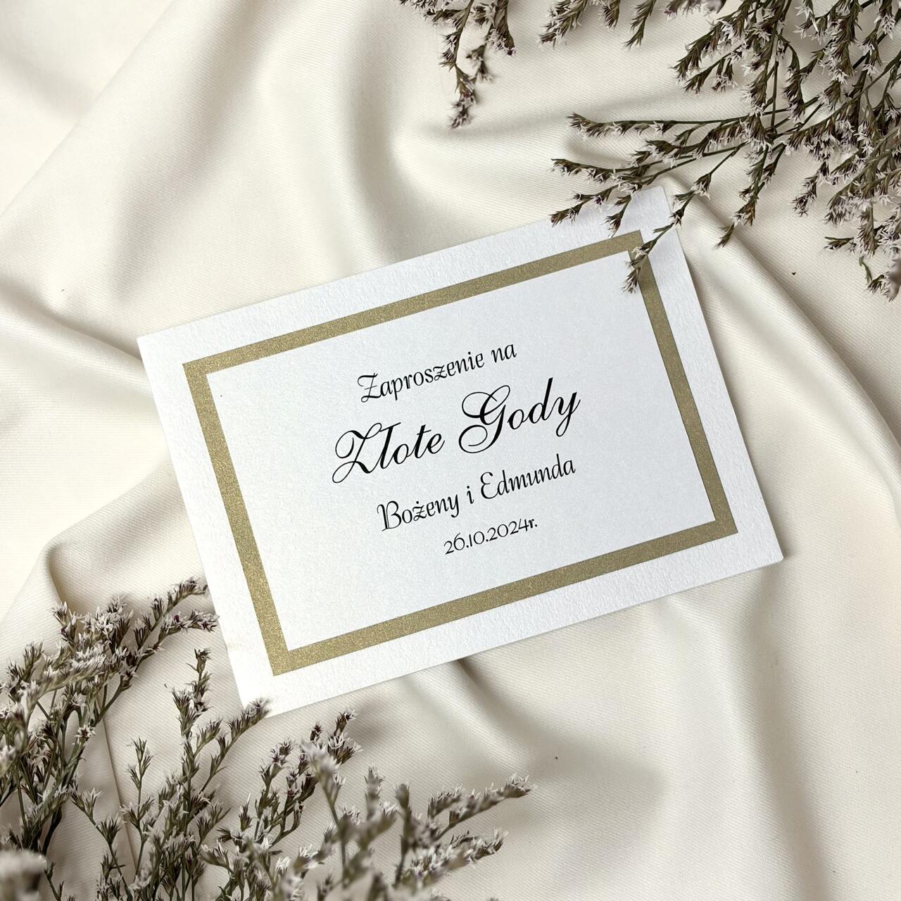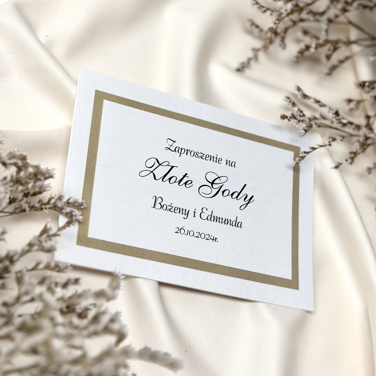 To subtelne zaproszenie na Złote Gody zachwyca swoją prostotą i klasą. Biel wysokiej jakości papieru pięknie współgra tu z delikatną, złotą ramką, tworząc harmonijną i uroczystą kompozycję. Minimalistyczny design podkreśla wyjątkowy charakter jubileuszu, pozostawiając w centrum najważniejsze — imiona jubilatów i datę świętowania.