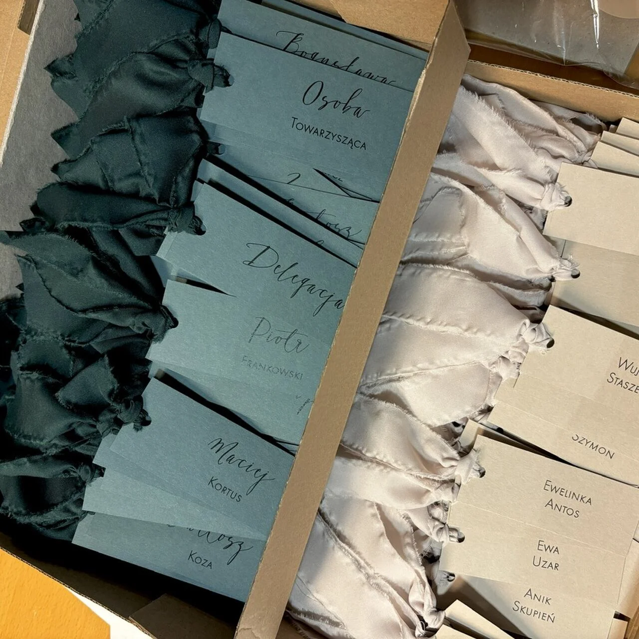 Delikatne, nowoczesne winietki weselne z personalizowanym nadrukiem i ozdobną ręcznie rwaną wstążką. Połączenie fakturowanego papieru w odcieniach nude lub butelkowej zieleni z miękką tkaniną o postrzępionych brzegach tworzy wyjątkowy efekt — naturalny, ale jednocześnie pełen klasy i elegancji.