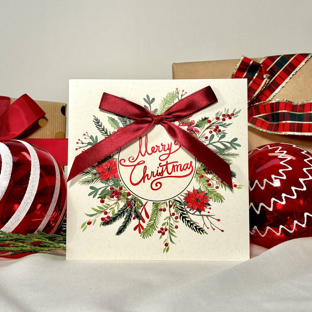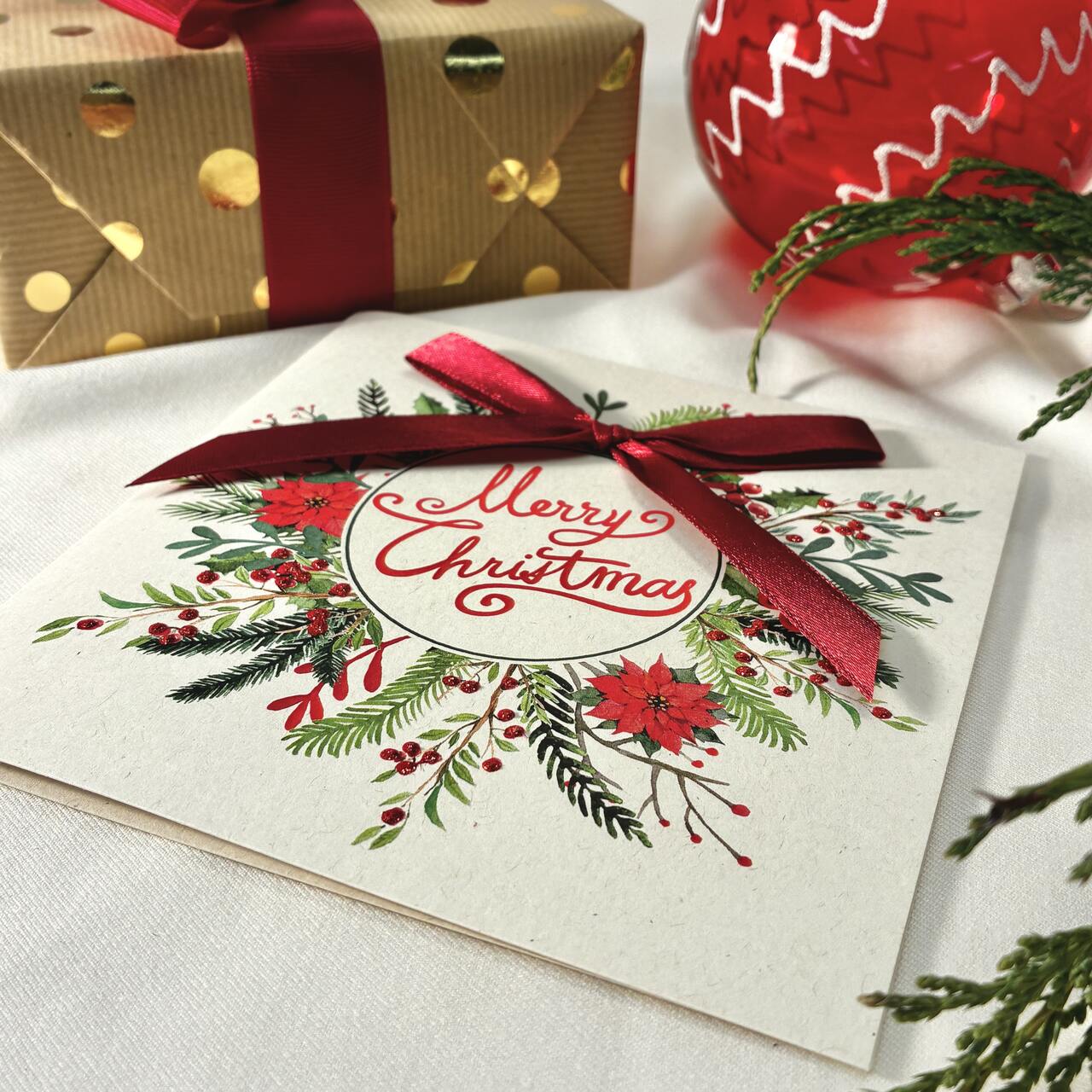 Kartka świąteczna Merry Christmas z piękną, florystyczną kompozycją i satynową czerwoną kokardą. Wyjątkowo efektowna, idealna jako dodatek do prezentu lub do wysłania świątecznych życzeń. Drukowana na papierze premium, wyróżnia się jakością i świątecznym charakterem. W zestawie dopasowana koperta.