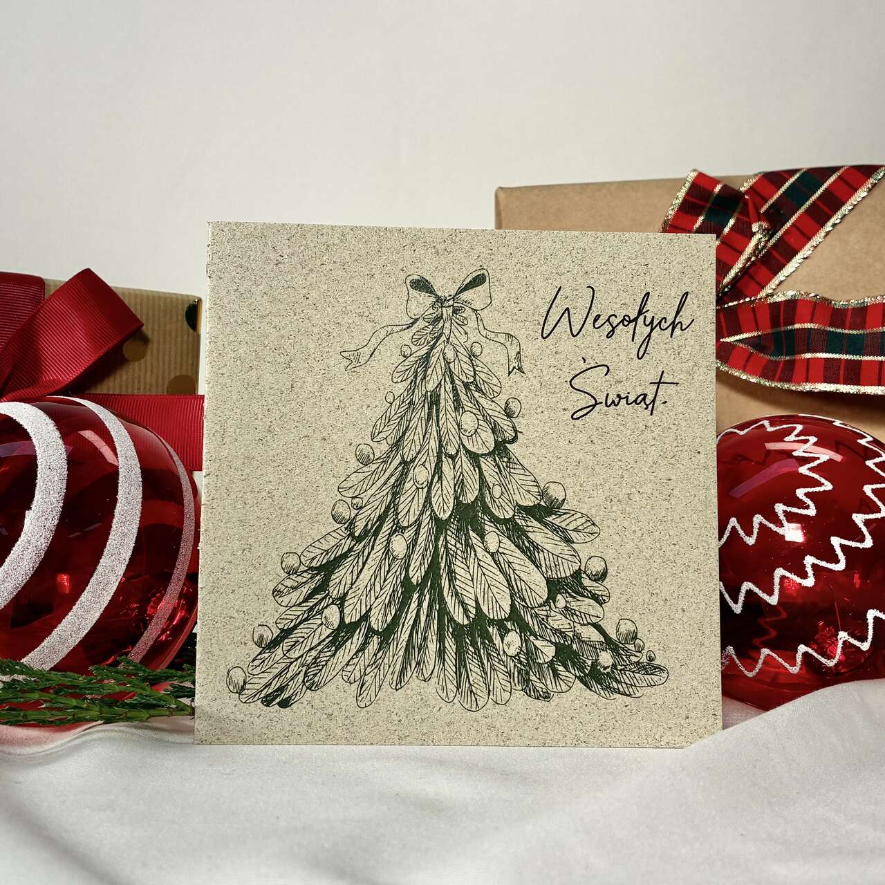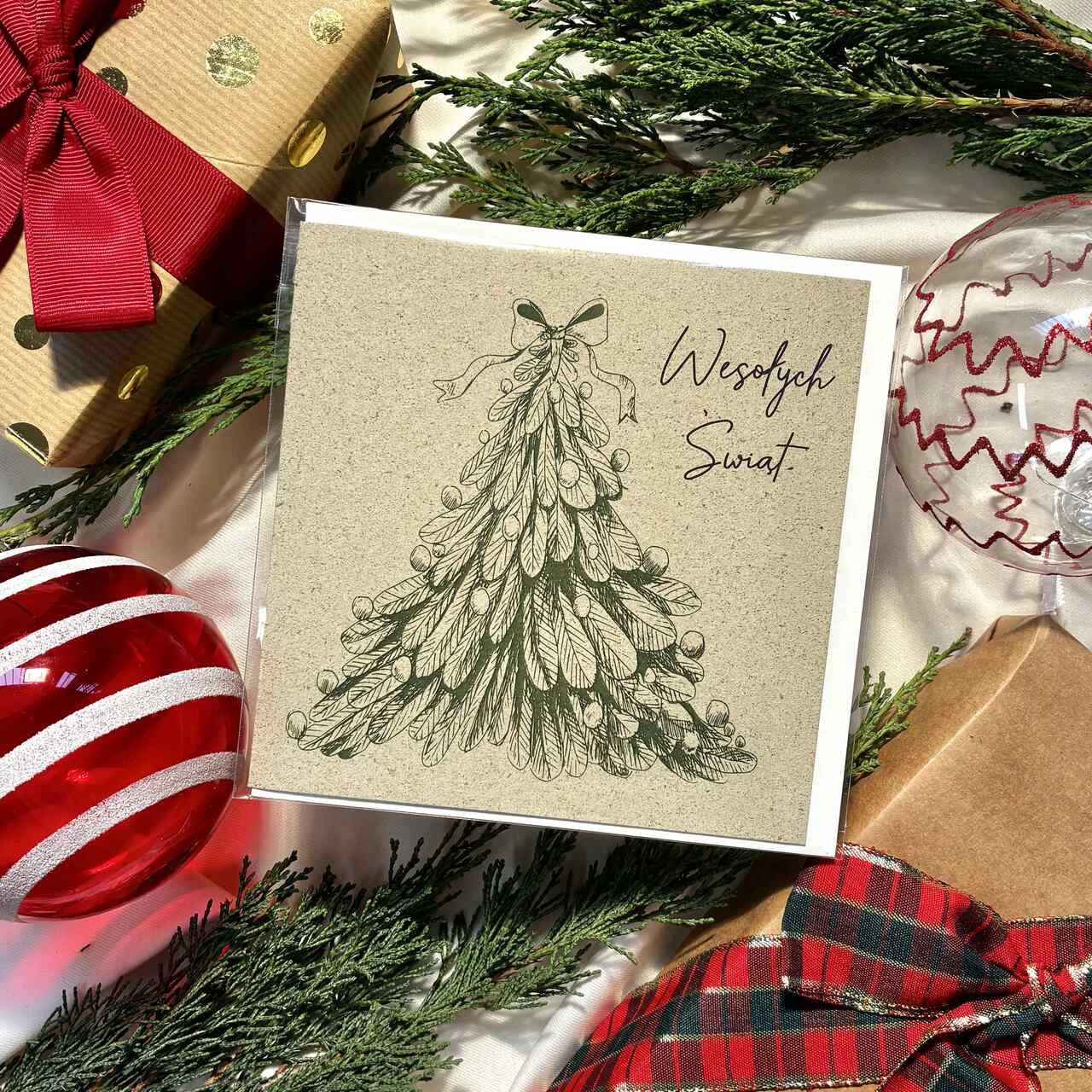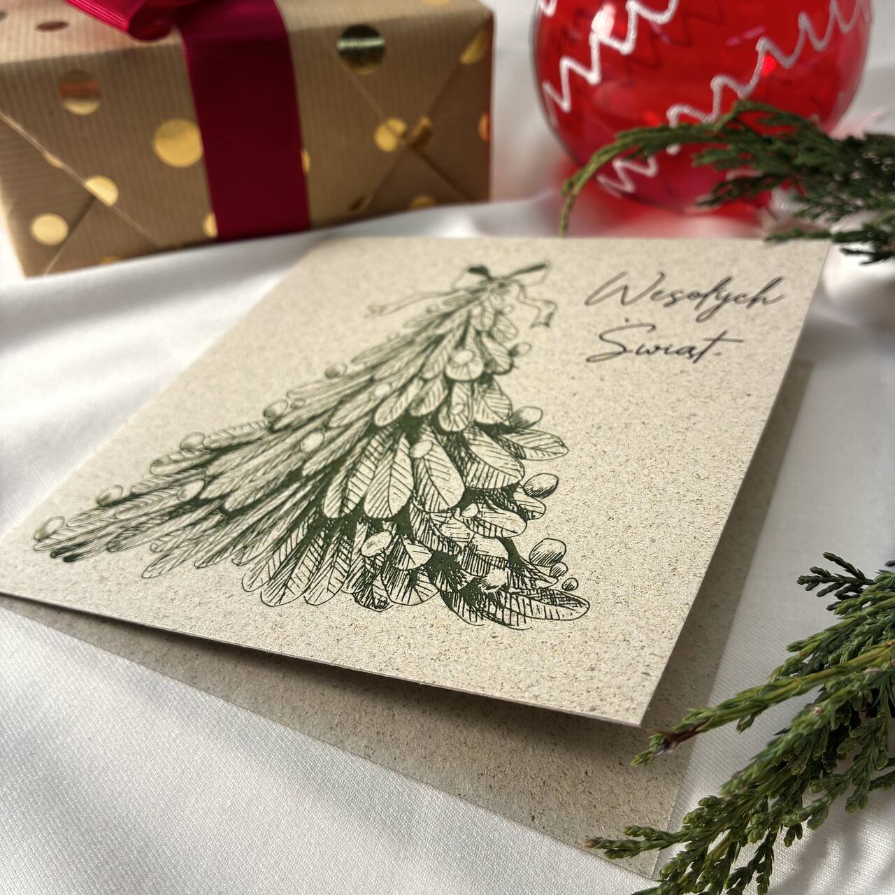 Kartka świąteczna z rysunkową choinką w minimalistycznym stylu. Subtelna ilustracja na naturalnym papierze tworzy efekt klasy i spokoju – idealna dla osób, które lubią prostotę i elegancję. Pięknie sprawdzi się do świątecznych życzeń, prezentów i firmowych upominków. W zestawie dopasowana koperta.