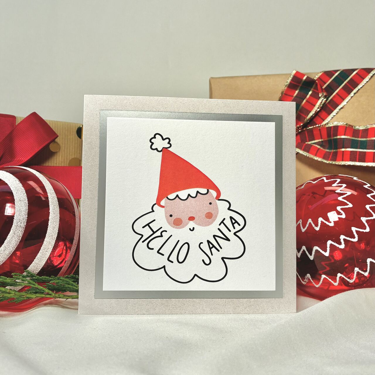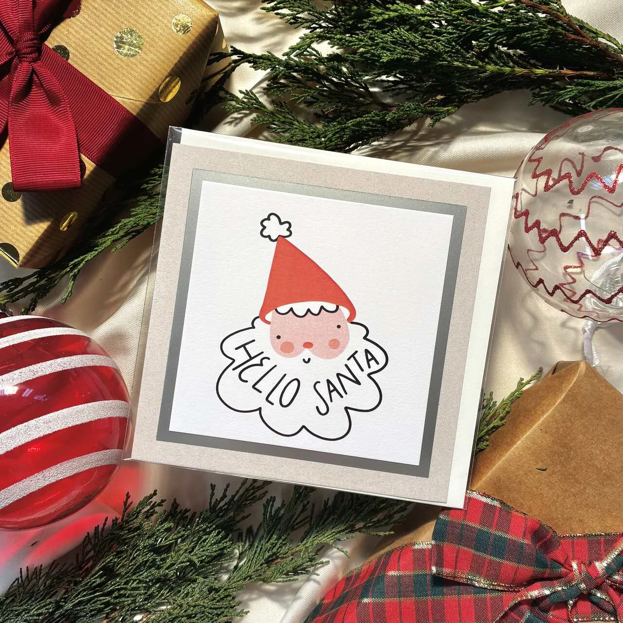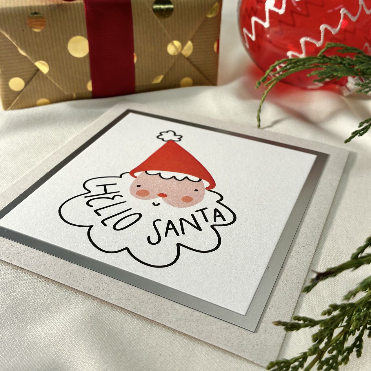 Kartka świąteczna z uroczym Mikołajem i napisem Hello Santa. Prosty, nowoczesny wzór, który wywołuje uśmiech od razu po otwarciu. Idealna do prezentów, życzeń i świątecznych paczek. Druk na wysokiej jakości papierze z elegancką ramką nadaje jej premium charakter. W zestawie dopasowana koperta.