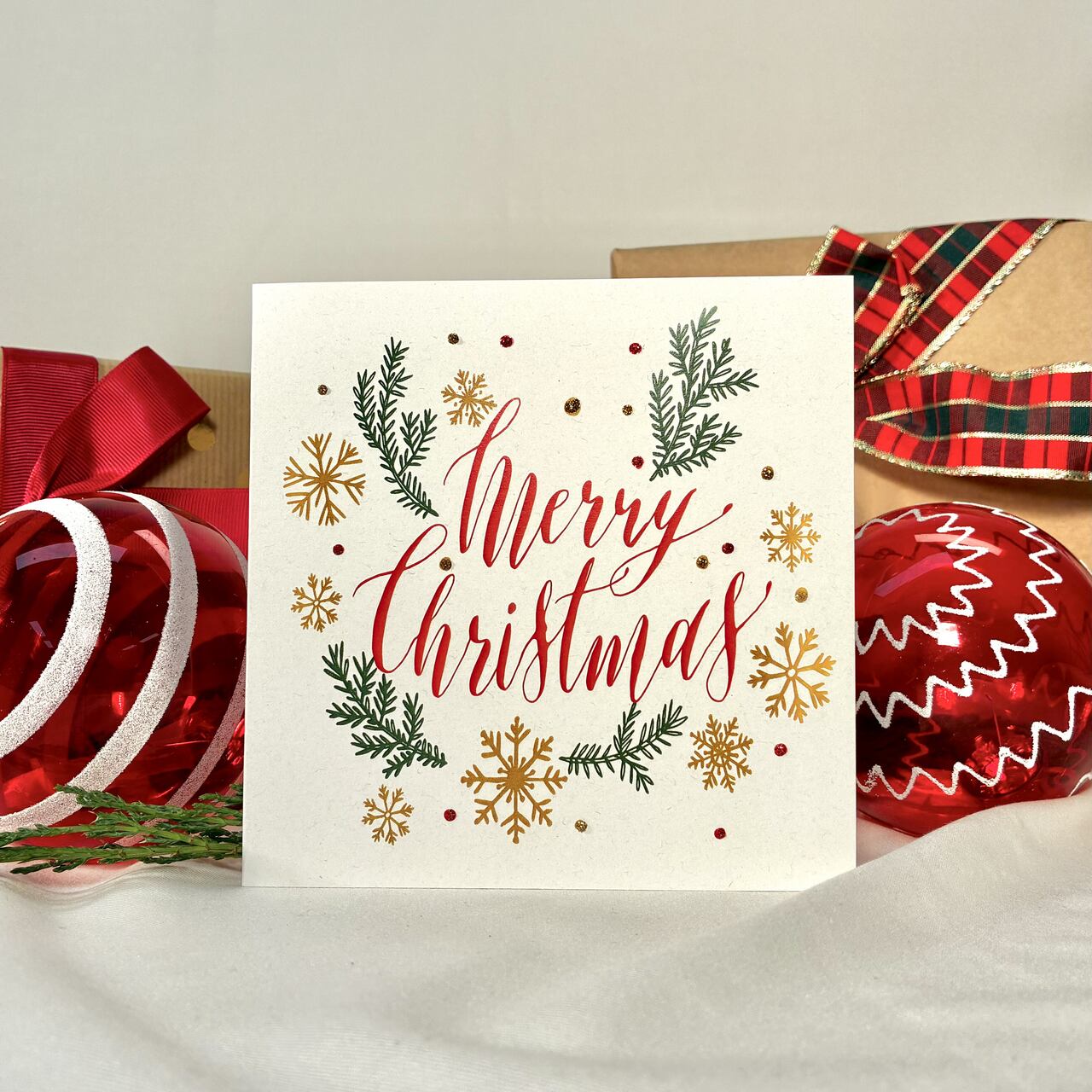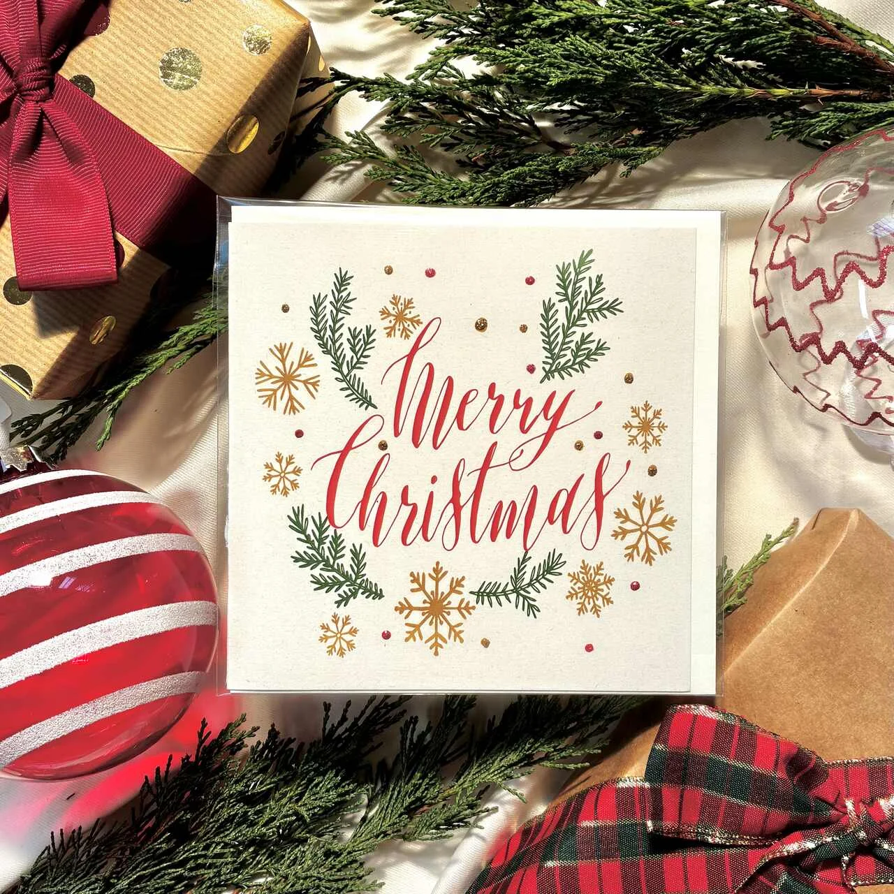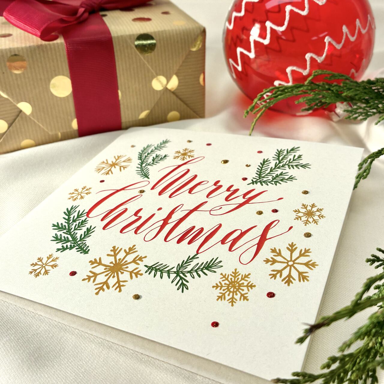 Kartka świąteczna Merry Christmas z elegancką typografią, złotymi śnieżynkami i zielonymi gałązkami. Klasyczna, efektowna i pełna świątecznego blasku. Druk na papierze premium podkreśla wysoką jakość i dbałość o detale. Idealna do prezentów, życzeń i świątecznych upominków. W zestawie dopasowana koperta.