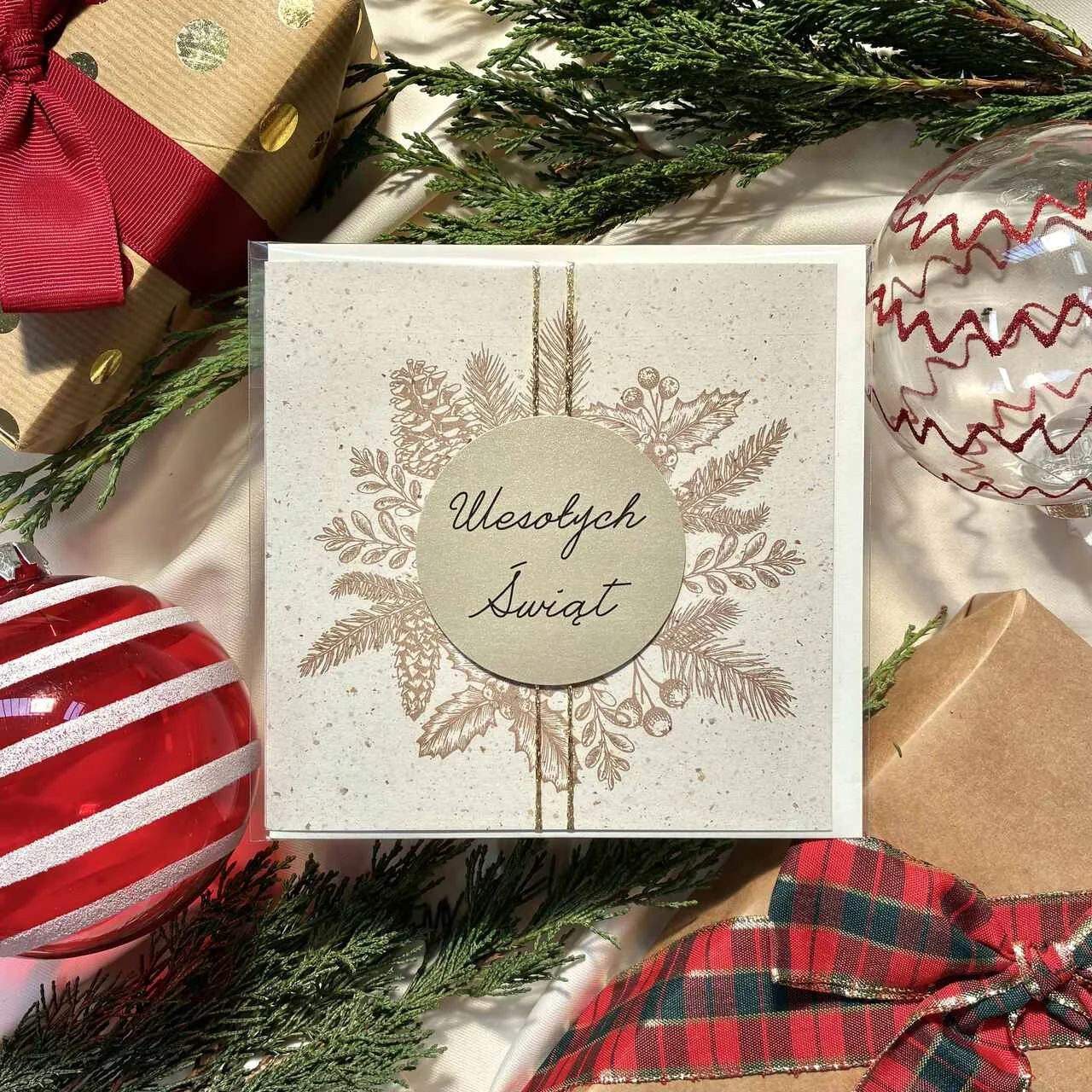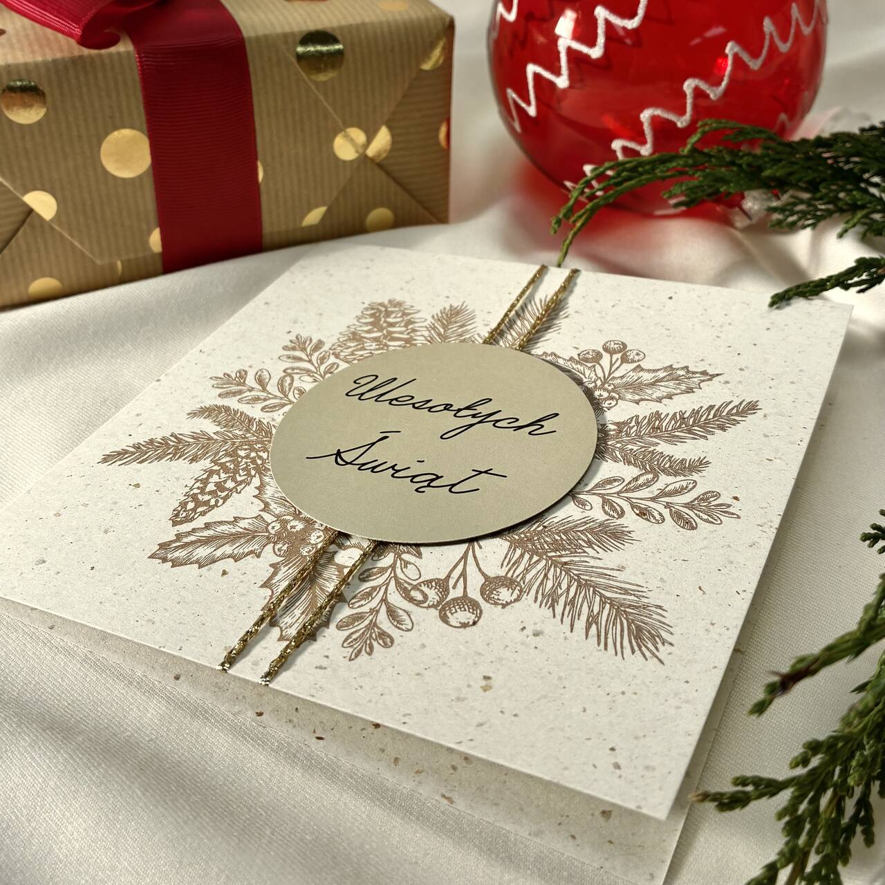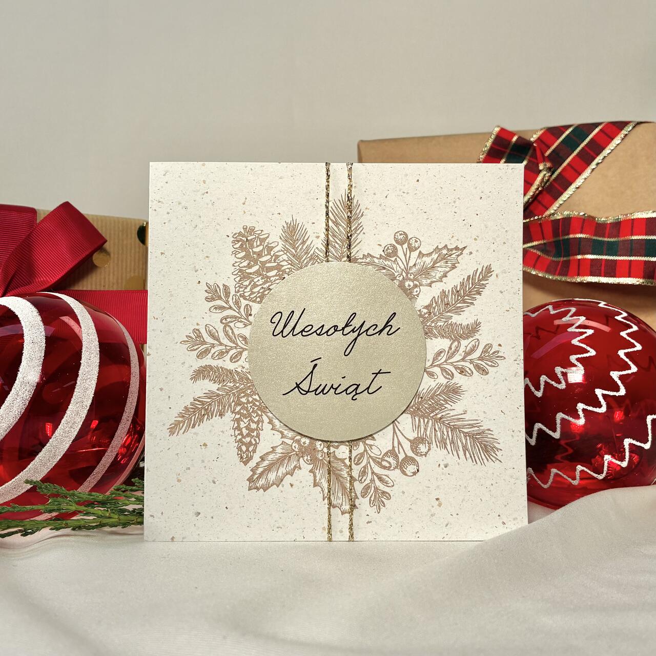 Kartka świąteczna z delikatnym, złotobrązowym wieńcem i medalionem „Wesołych Świąt”. Subtelna, klasyczna i bardzo stylowa – idealna dla osób, które lubią stonowane, naturalne motywy. Papier premium i złote detale nadają jej wyjątkowo elegancki charakter. Doskonała do prezentów i świątecznych życzeń. W zestawie dopasowana koperta.