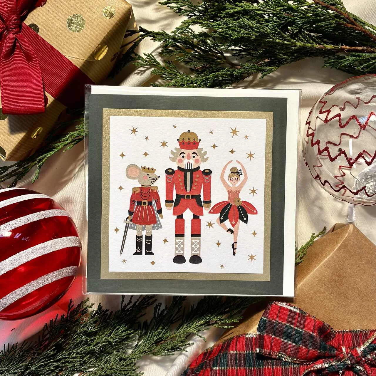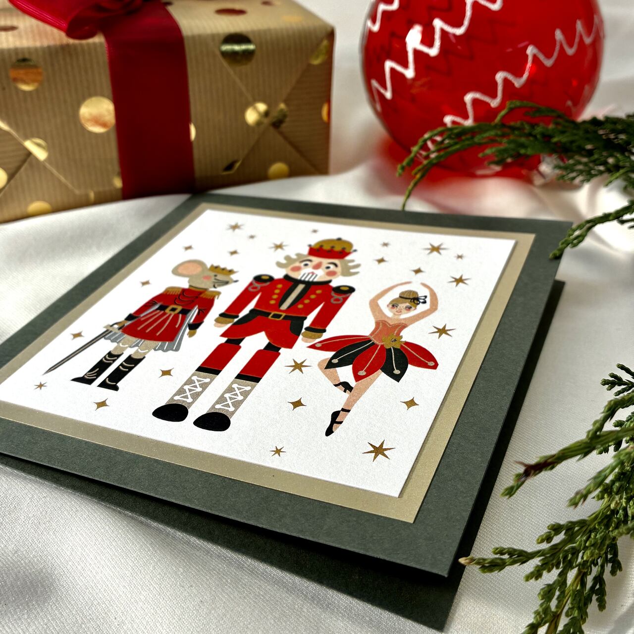 Kartka świąteczna inspirowana klasycznym „Dziadkiem do orzechów” – z eleganckimi postaciami i złotymi akcentami. Stylowa, teatralna i pełna świątecznego uroku. Druk na papierze premium oraz ozdobna ramka podkreślają jej wyjątkowy charakter. Idealna do prezentów, życzeń i świątecznych upominków. W zestawie dopasowana koperta. Specyfikacja – format 134 x 134 mm, możliwość zmiany formatu kartki– wysokiej jakości papier o gramaturze min. 250 g– koperta biała lub ecru w komplecie