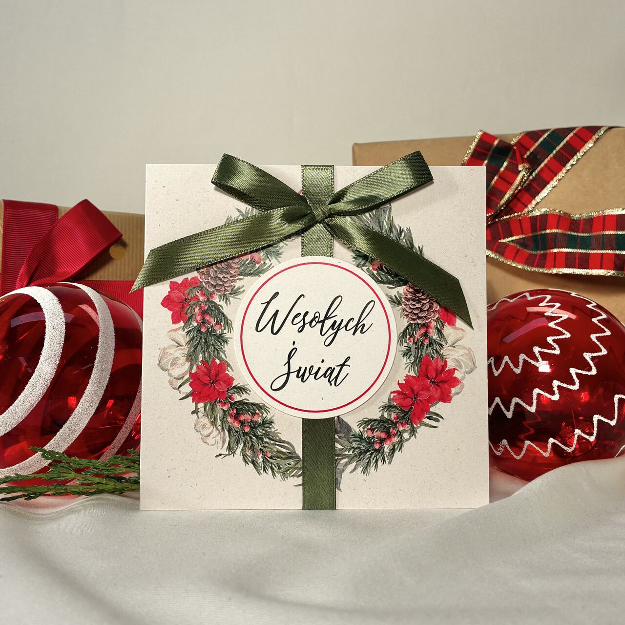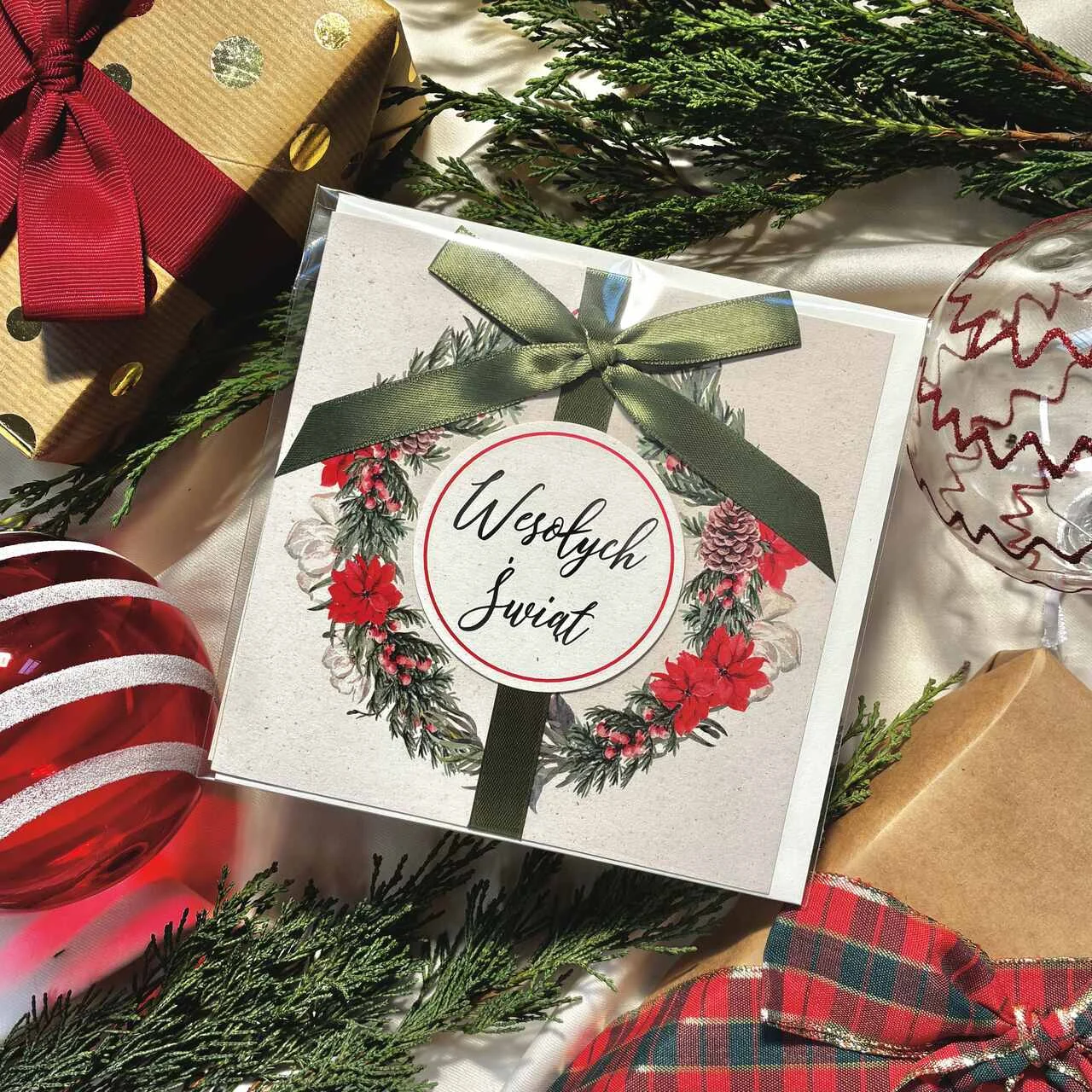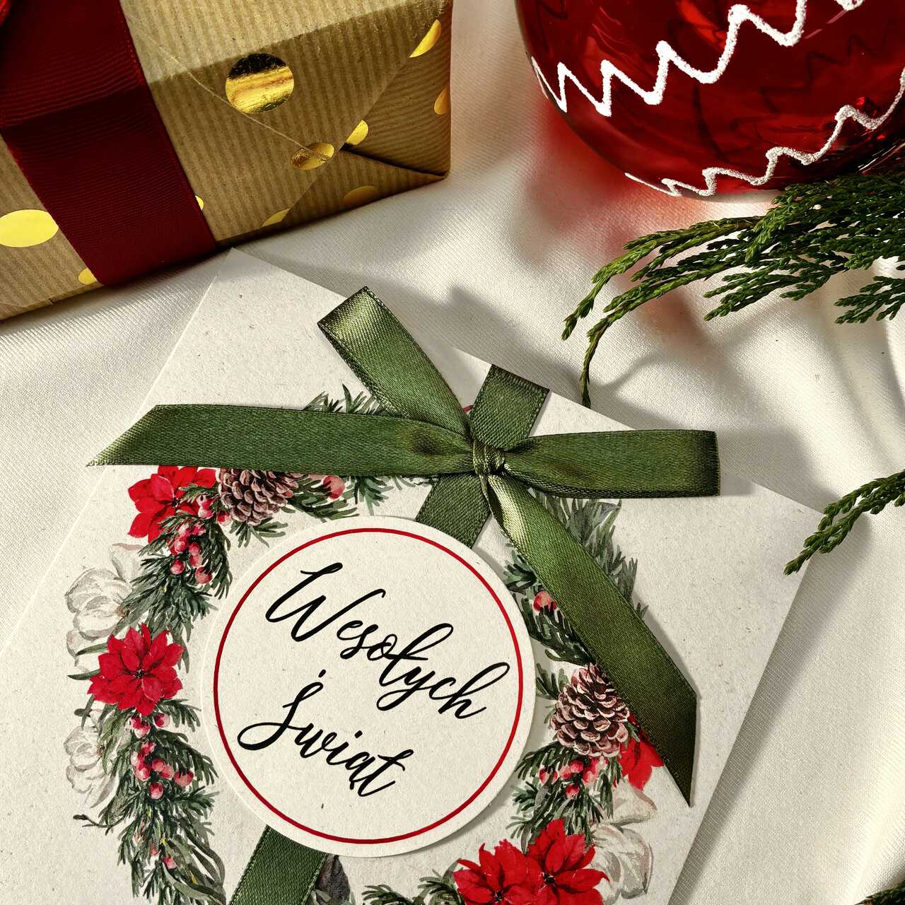Kartka świąteczna z eleganckim wieńcem i napisem „Wesołych Świąt”, ozdobiona satynową zieloną kokardą. Klasyczna, efektowna i pełna świątecznego uroku. Druk na papierze premium podkreśla jakość i dbałość o detale. Idealna do prezentów i świątecznych życzeń. W zestawie dopasowana koperta.