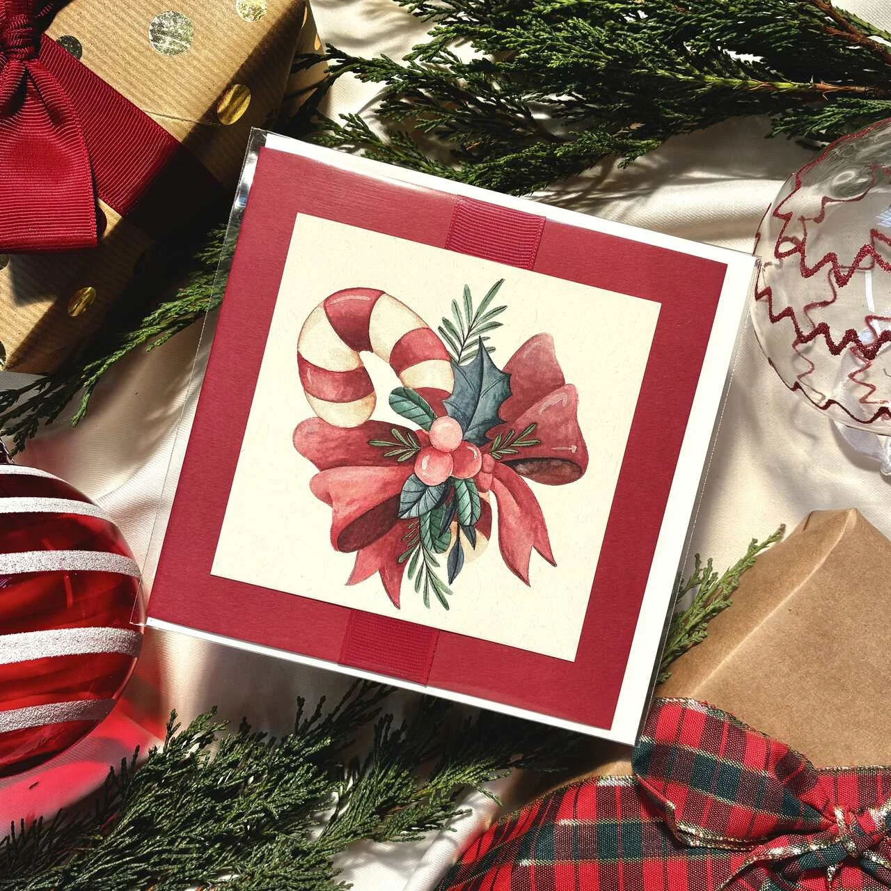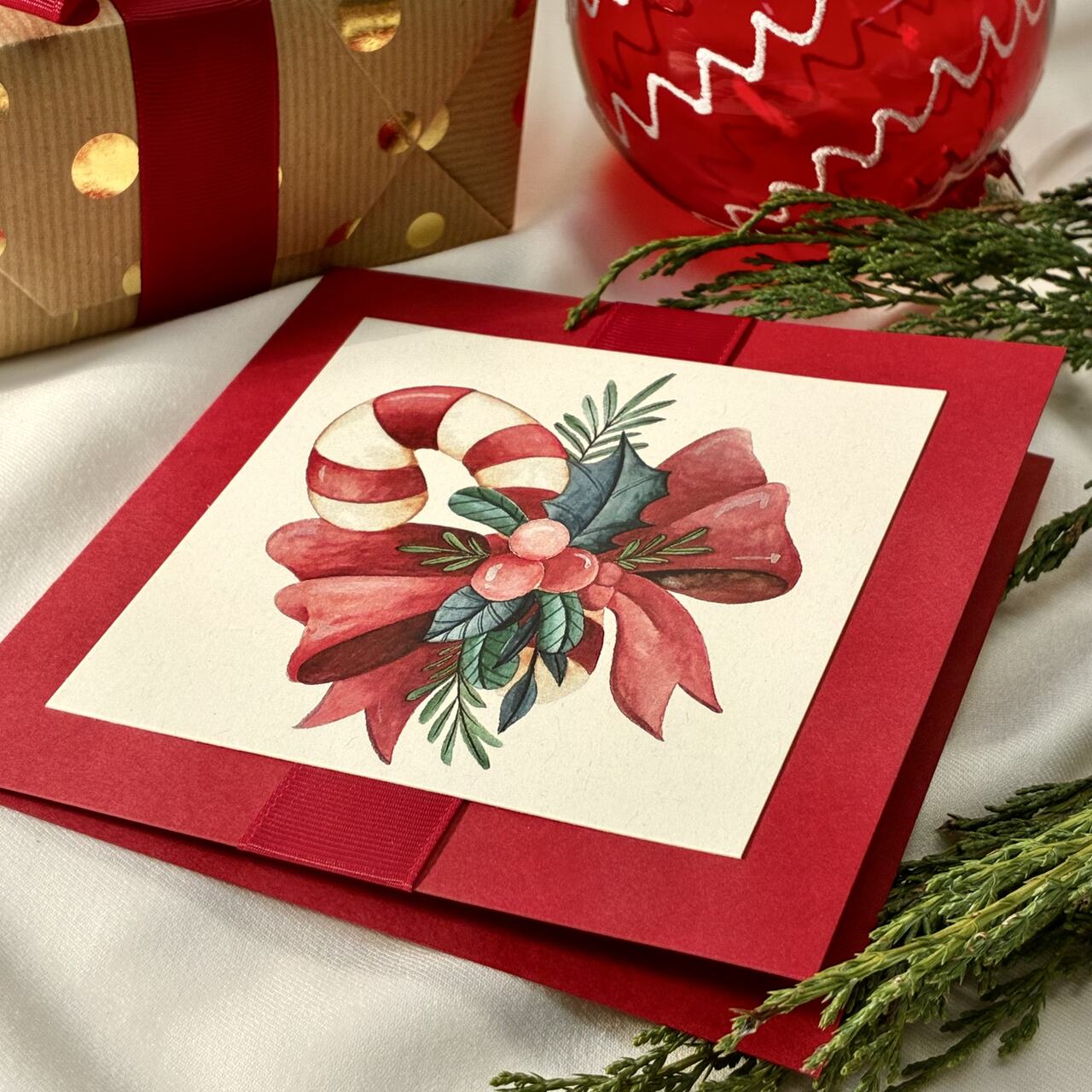 Kartka świąteczna z cukrową laską i czerwono-zieloną kompozycją to elegancka propozycja dla osób, które kochają klasyczne świąteczne motywy. Intensywna czerwień, akwarelowe zdobienia i solidny papier premium sprawiają, że kartka wygląda wyjątkowo efektownie. Idealna do prezentu, życzeń i świątecznych upominków. W zestawie dopasowana koperta.