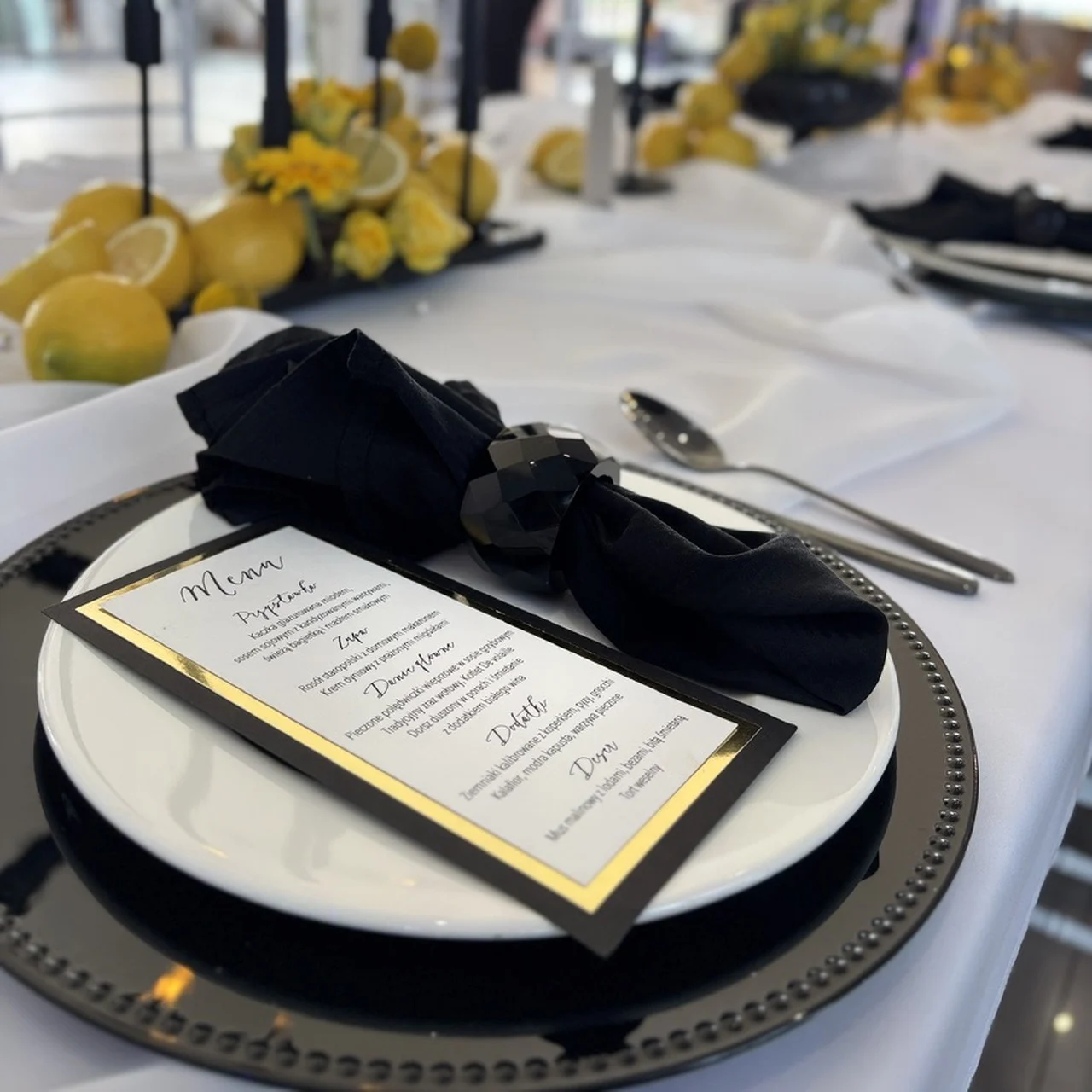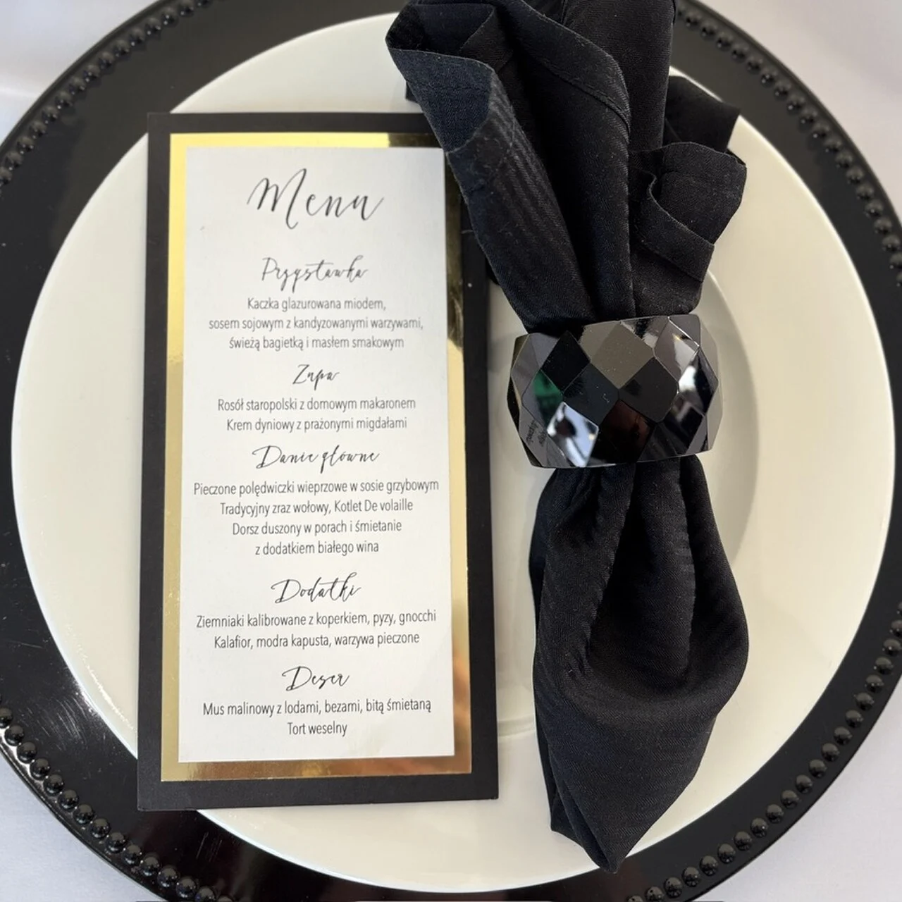 To idealna propozycja dla par organizujących ślub w stylu glamour, nowoczesnym lub wieczorowym. Połączenie bieli, czerni i złota nadaje aranżacji stołu klasy i wyrafinowania. Menu można dopasować do pozostałych elementów papeterii ślubnej, takich jak zaproszenia, winietki czy plan stołów, tworząc spójną, elegancką całość.