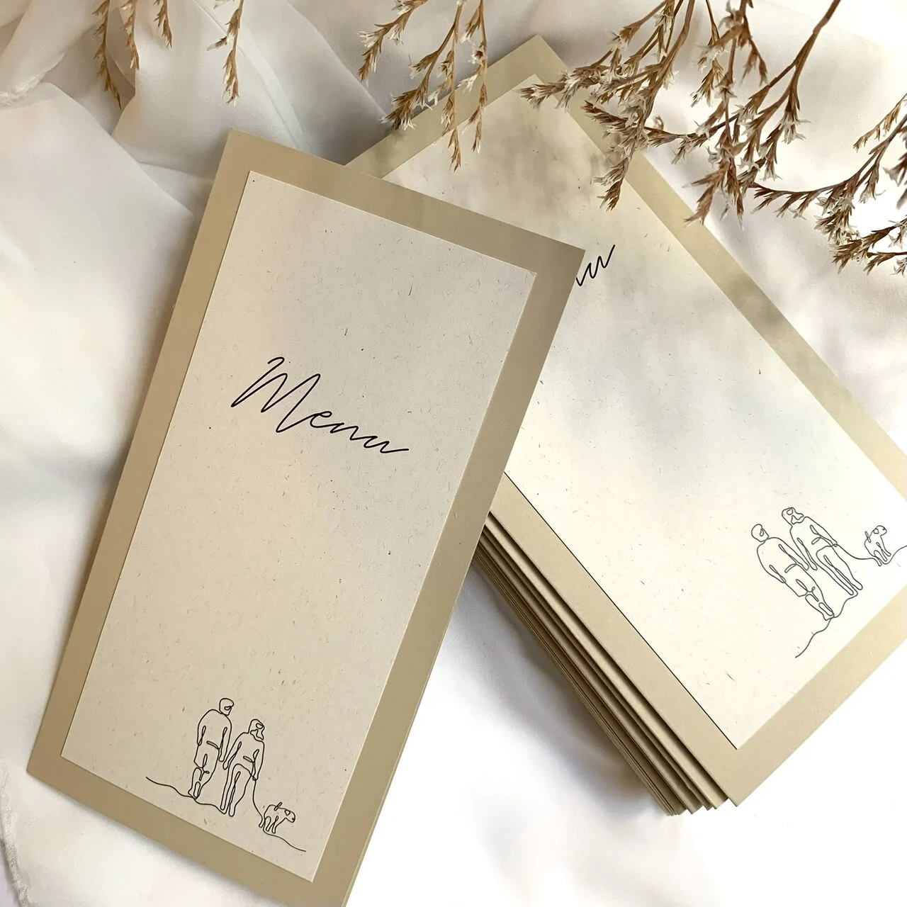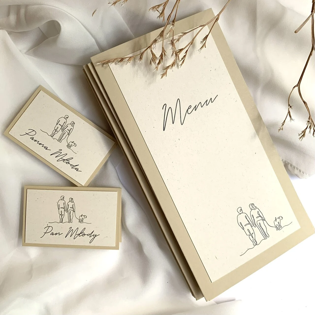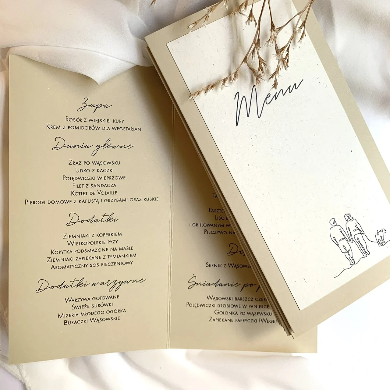 Subtelne i eleganckie menu weselne w odcieniach beżu, wykonane na papierze o gramaturze 250 g. Otwierana forma i minimalistyczna grafika tworzą kompozycję w duchu prostoty i naturalności. Delikatna ramka oraz rysunek pary dodają całości wyjątkowego, osobistego charakteru.