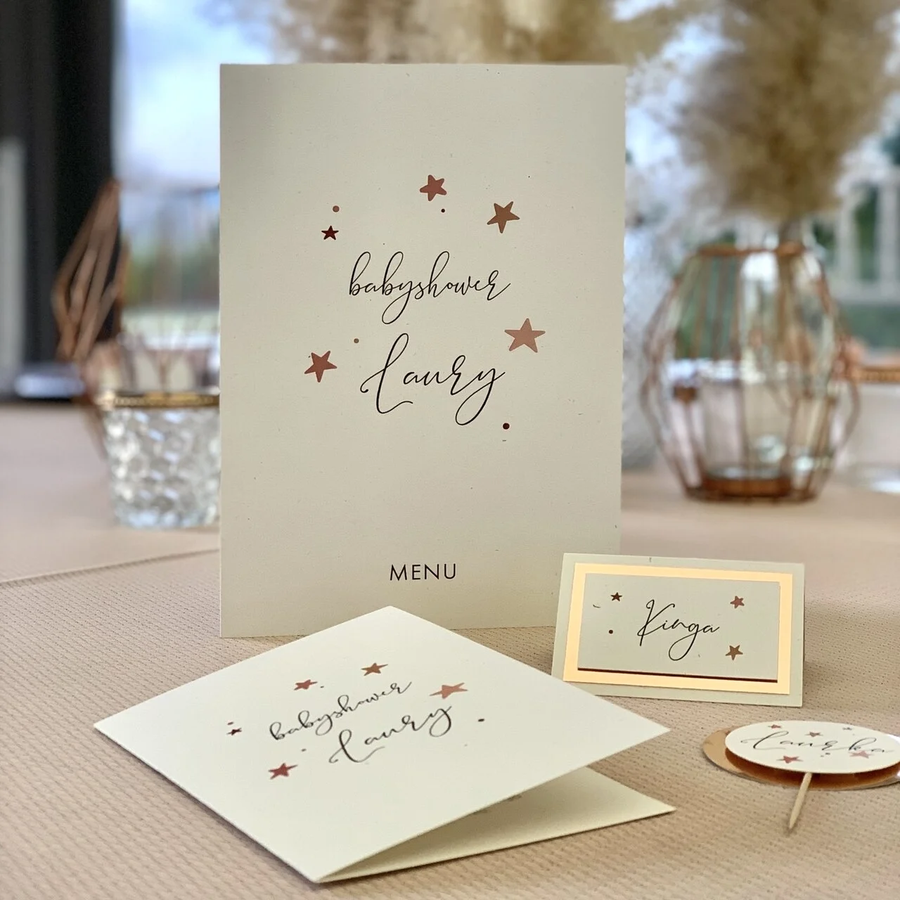 Subtelny i elegancki zestaw papeterii przygotowany specjalnie na baby shower. W skład projektu wchodzi menu, winietka oraz topper, utrzymane w spójnej, ciepłej kolorystyce beżu z akcentami w odcieniu różowego złota.
