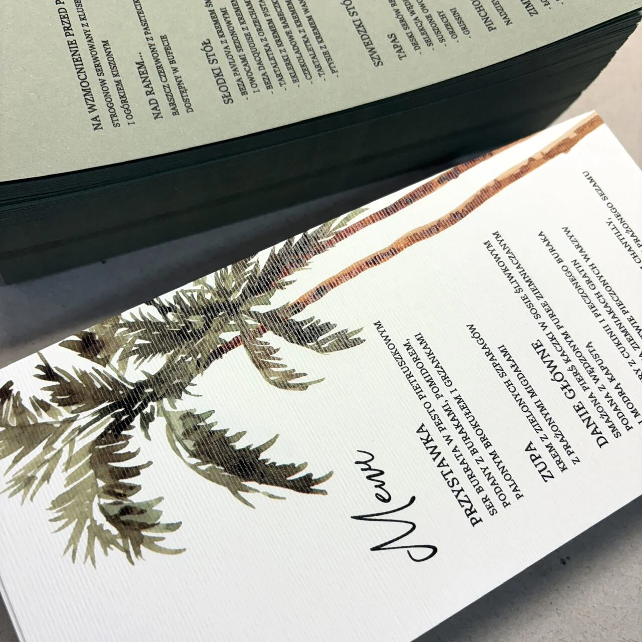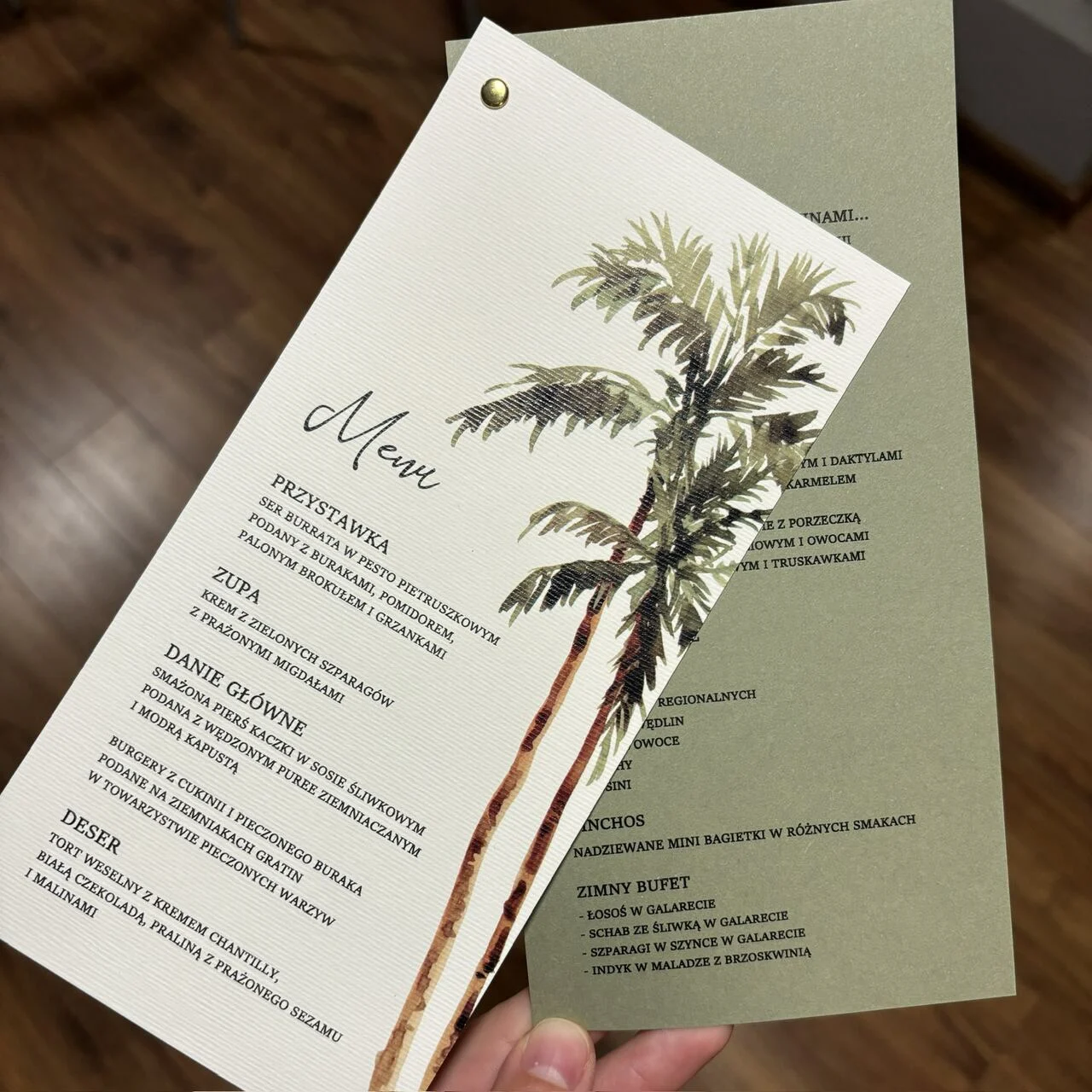 Nowoczesne menu weselne w tropikalnym stylu, drukowane na wysokiej jakości papierze o gramaturze 250 g. Subtelna faktura papieru i delikatny nadruk palm tworzą elegancką, naturalną kompozycję, która pięknie dopełni dekoracje w stylu boho, rustykalnym lub śródziemnomorskim.