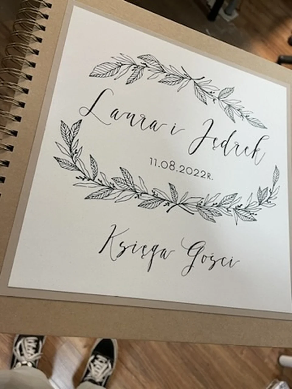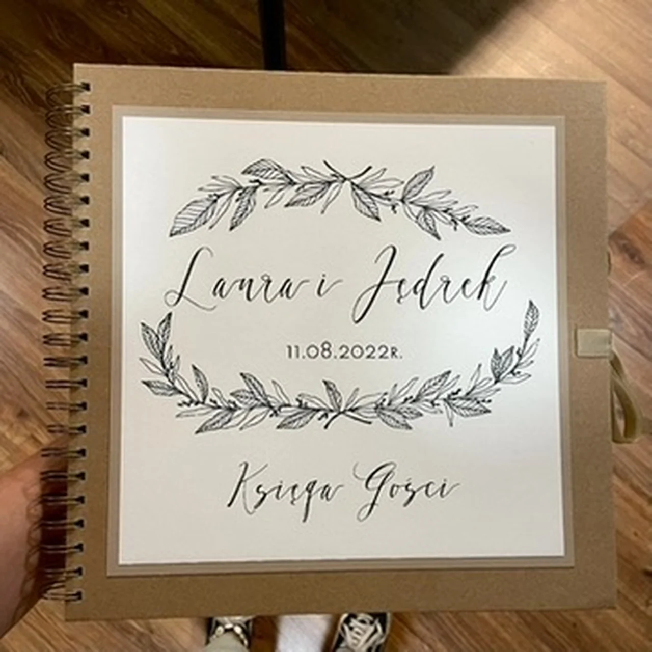 Twarda okładka i spiralne bindowanie gwarantują trwałość i wygodę użytkowania. Beżowa wstążka dodaje miękkości, a personalizowany nadruk sprawia, że każda księga staje się wyjątkową pamiątką dla pary młodej.