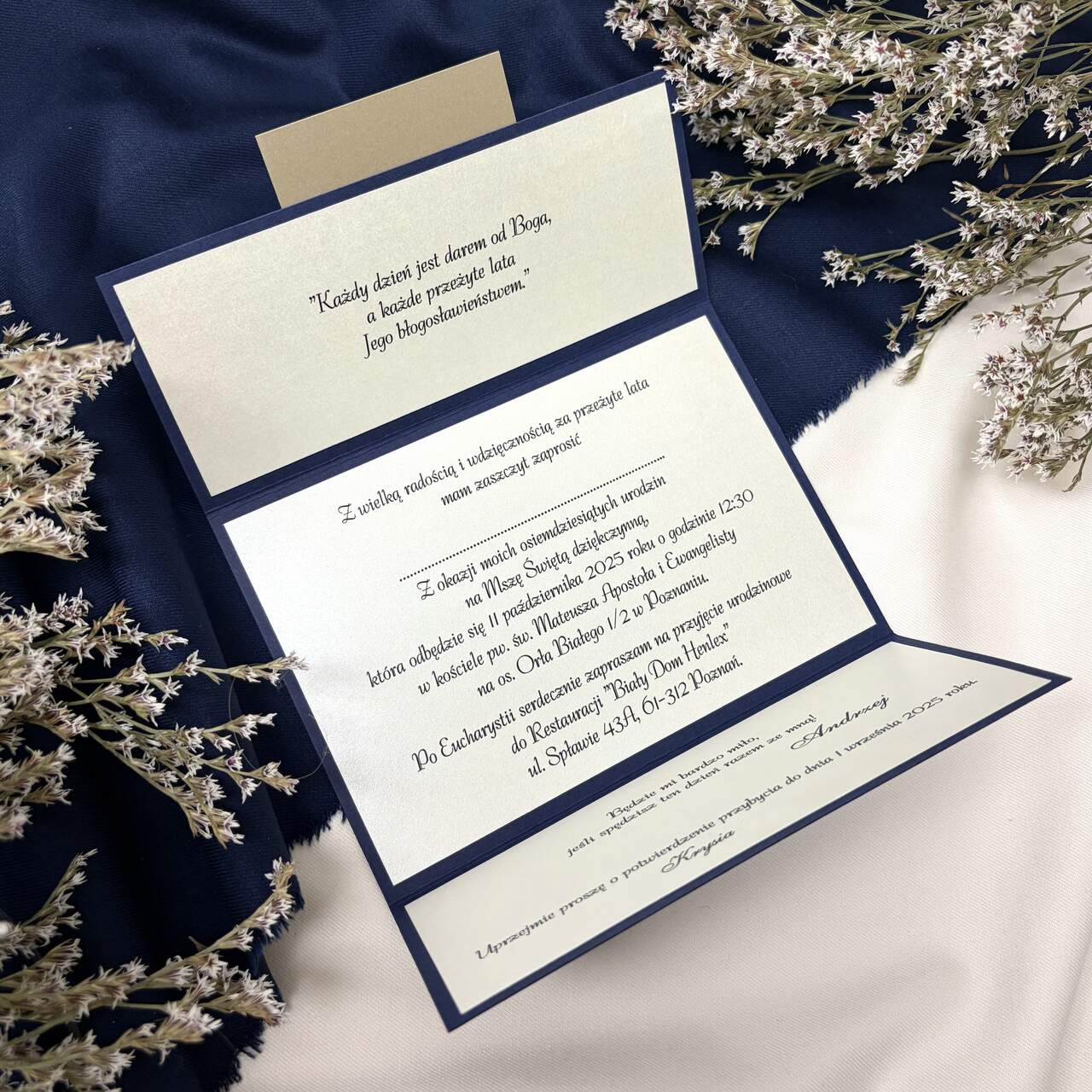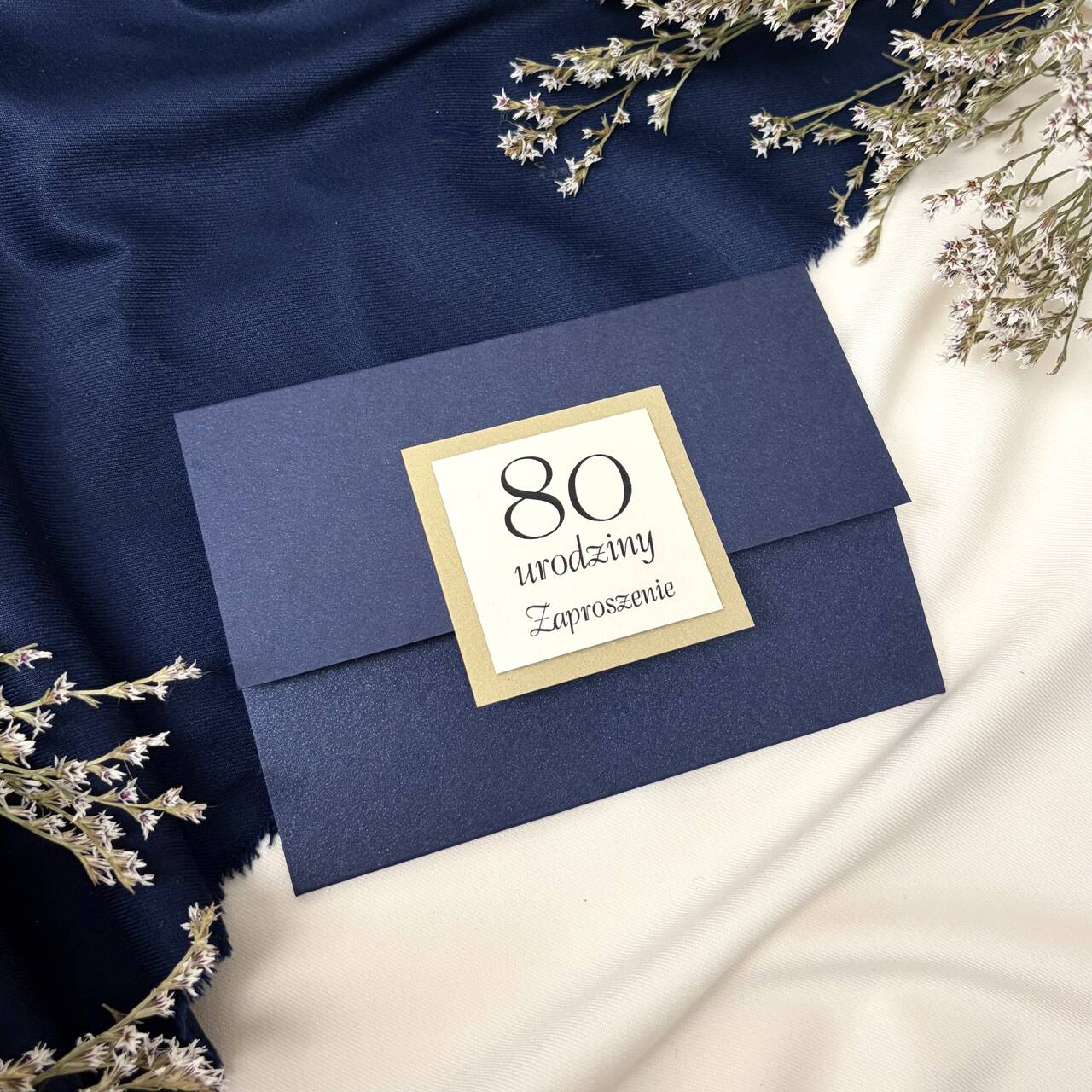 Zaproszenie w odcieniach granatu i złota to klasyczna i ponadczasowa propozycja na wyjątkową uroczystość 80 urodzin. Minimalistyczny front, delikatny połysk papieru i elegancka ramka nadają mu szyku, podkreślając rangę świętowanego jubileuszu. To zaproszenie, które w piękny i dostojny sposób zapowiada wyjątkowe spotkanie w gronie najbliższych!