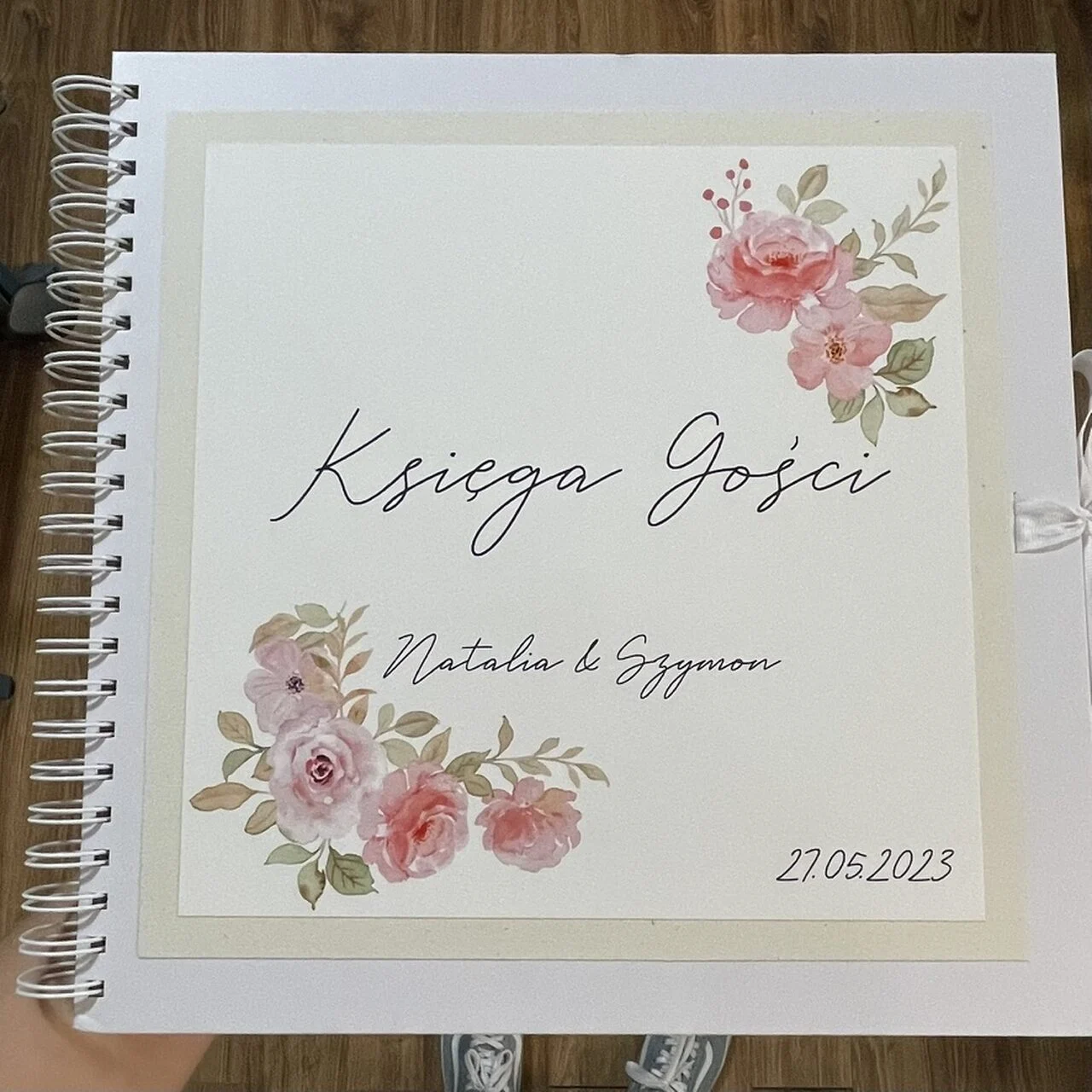 Okładka wykonana jest z grubego kartonu w kolorze ecru, z delikatną beżową ramką, a wnętrze spięte spiralą, co zapewnia wygodę użytkowania i trwałość. Biała wstążka dopełnia całość, dodając lekkości i eleganckiego wykończenia.