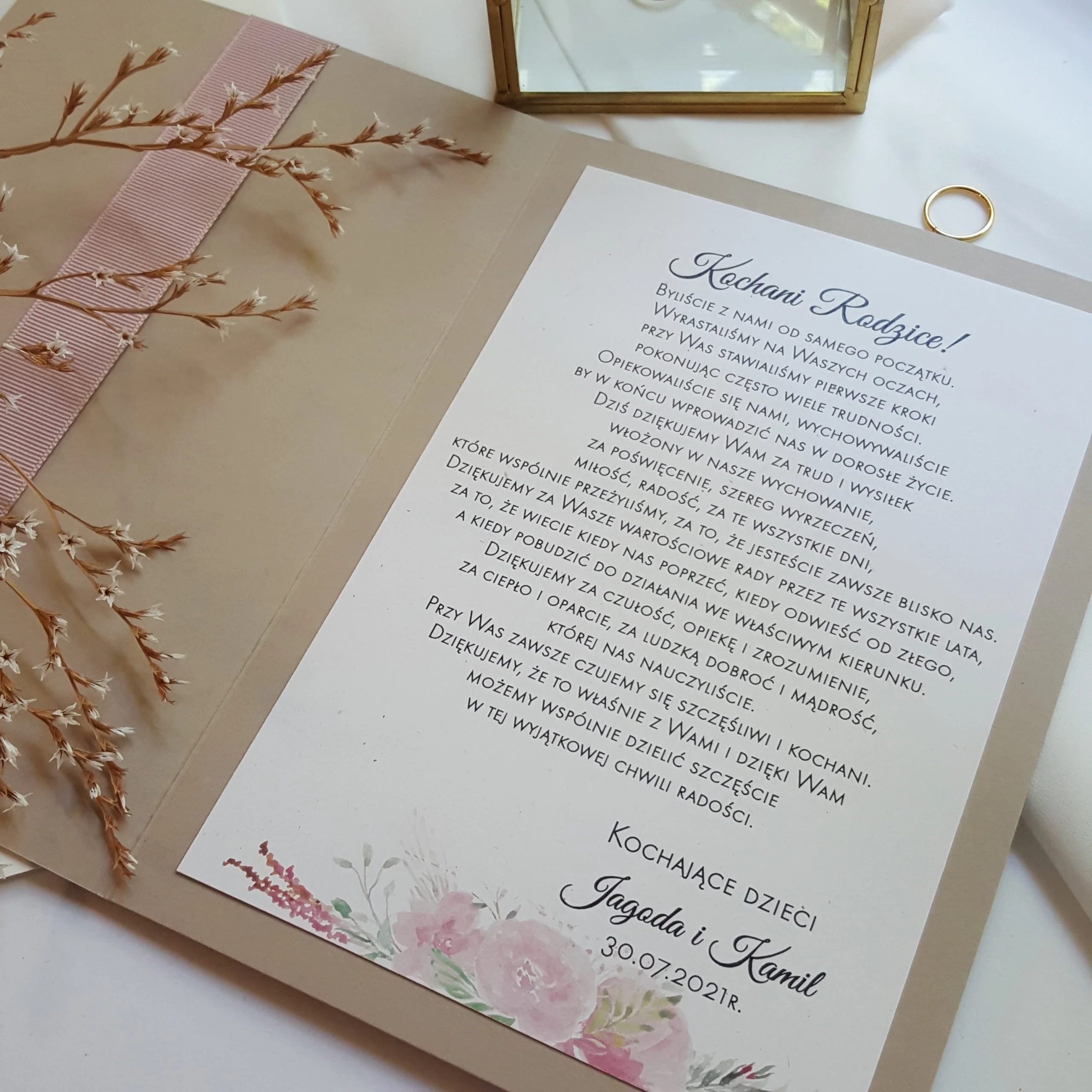 Podziękowanie dla rodziców jest wyjątkową pamiątką tego najważniejszego dnia w Waszym życiu. Zachowanie w w wybranym przez Was wzorze papeterii będzie stanowiło piękny upominek.