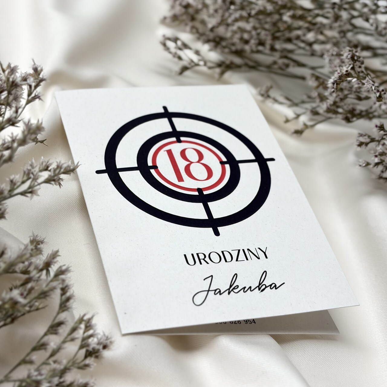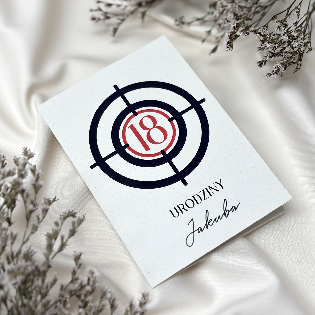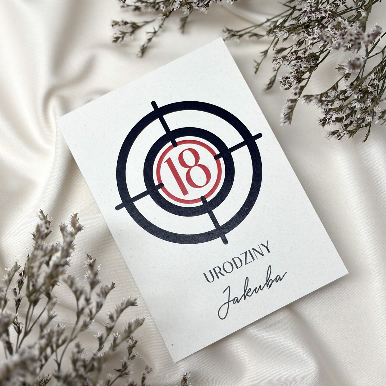 To zaproszenie w nowoczesnym i stylowym wydaniu od razu przyciąga wzrok. Połączenie czerni, bieli i czerwieni tworzy wyrazisty, a jednocześnie elegancki efekt. Oryginalny motyw tarczy dodaje całości energii i sprawia, że zaproszenie jest nie tylko wyjątkowe, ale też zabawne i zapadające w pamięć. Idealne, aby zapowiedzieć imprezę, która trafi w dziesiątkę!