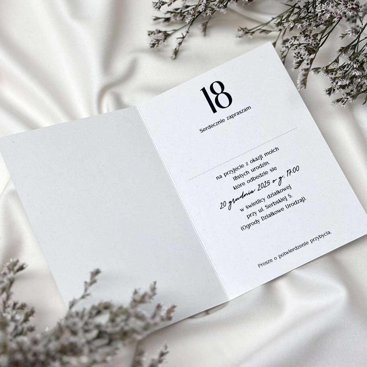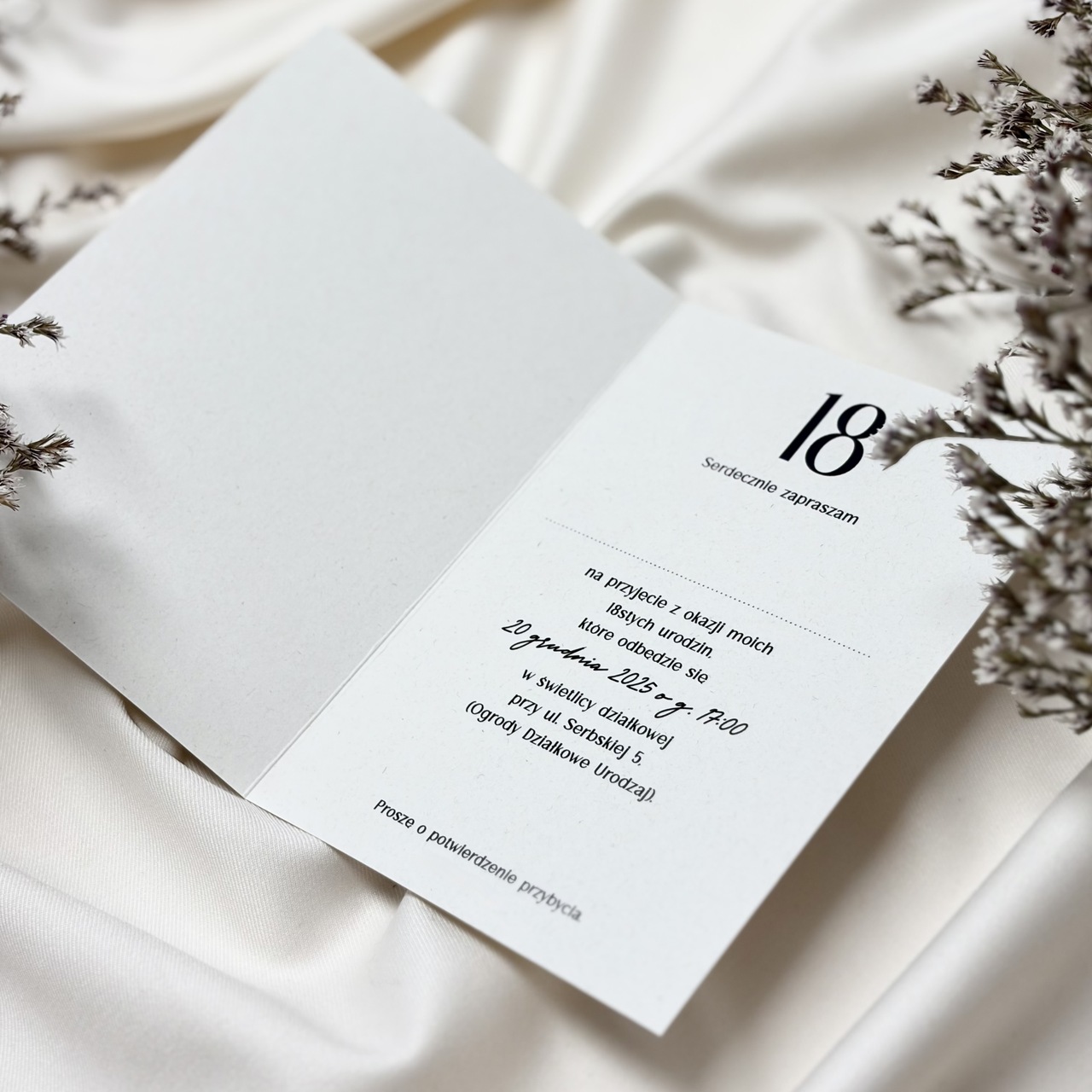 Uniwersalne zaproszenia ślubne wkomponują się w każdy motyw ślubu i wesela. Trójwymiarowa biała wstążka nadaje im dodatkowej subtelności i przejrzystości. To propozycja dla wszystkich zakochanych w tradycji i prostocie. W cenie: zaproszenie w formacie 134x134mm o gramaturze 250g koperta biała lub ecru o gramaturze 120g projekt zaproszenia Zawiadomienie: jednostronne (7,00zł) otwierane (8,00zł)   ⭑ Prezentowany wzór jest niezwykle uniwersalny! Może zostać swobodnie dostosowany do każdej innej liczby urodzinowej, a także do zupełnie innej okoliczności czy jubileuszu. Istnieje również możliwość zmiany kolorystyki całego projektu. ⭑ Przy zamówieniach poniżej 20 szt. doliczana jest dopłata 30 zł do całości zamówienia.