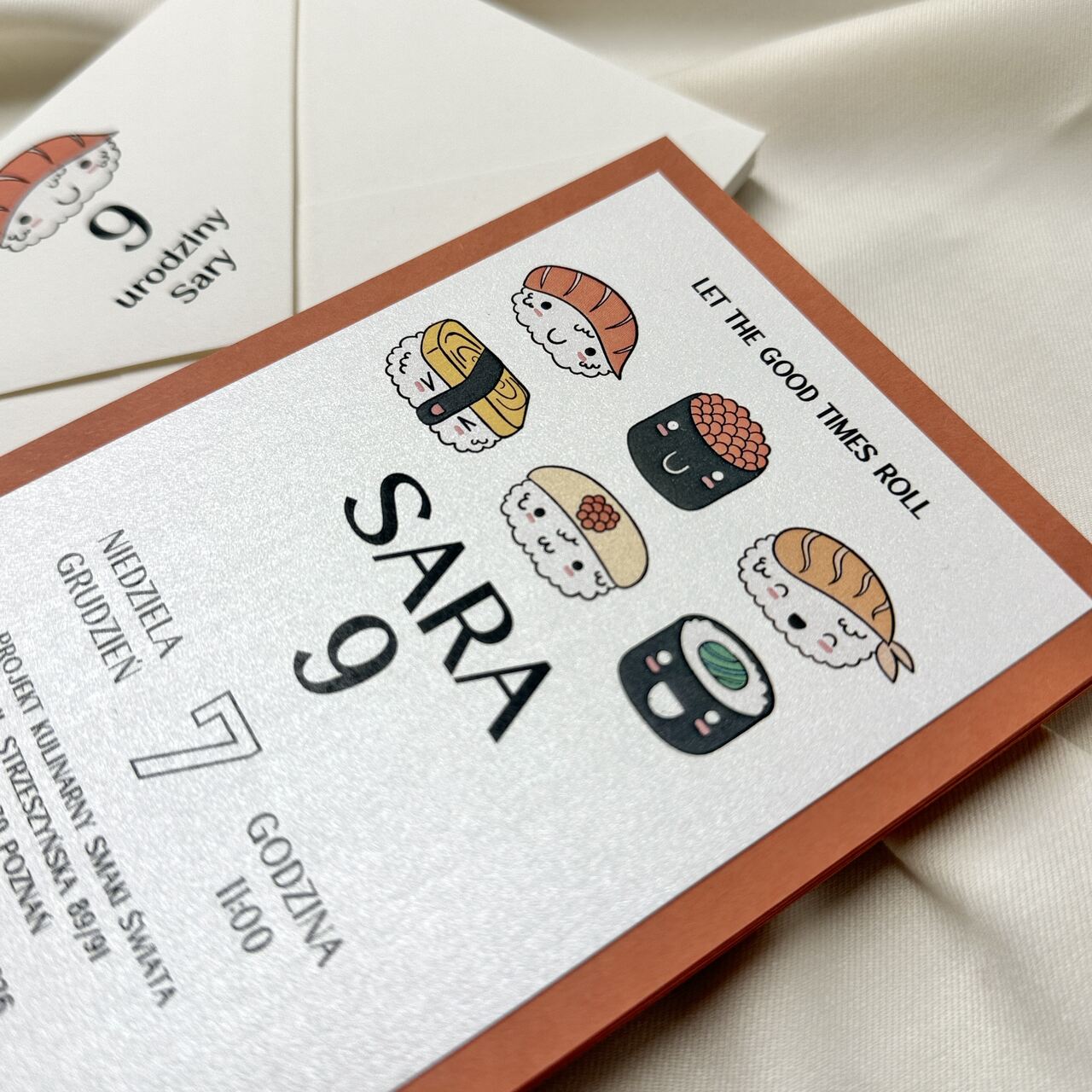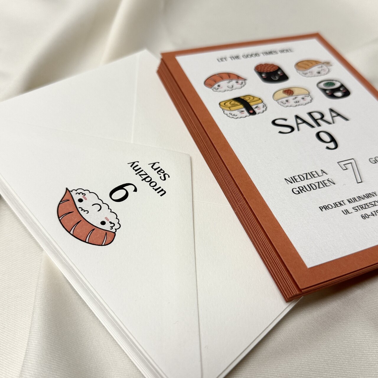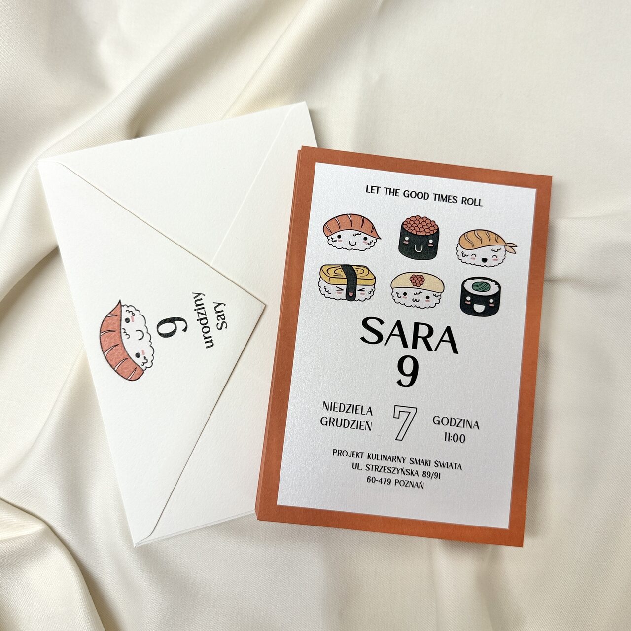 Pełne uroku zaproszenie w sushi-klimacie, idealne dla miłośników azjatyckich smaków! Uśmiechnięte, kawaii sushi nadają kartce radosny charakter i sprawiają, że już na pierwszy rzut oka czuć dobrą zabawę. To wyjątkowy sposób, aby zaprosić gości na urodziny pełne śmiechu, kolorów i smacznych wspomnień. Idealne na dziecięcą imprezę w niepowtarzalnym stylu!