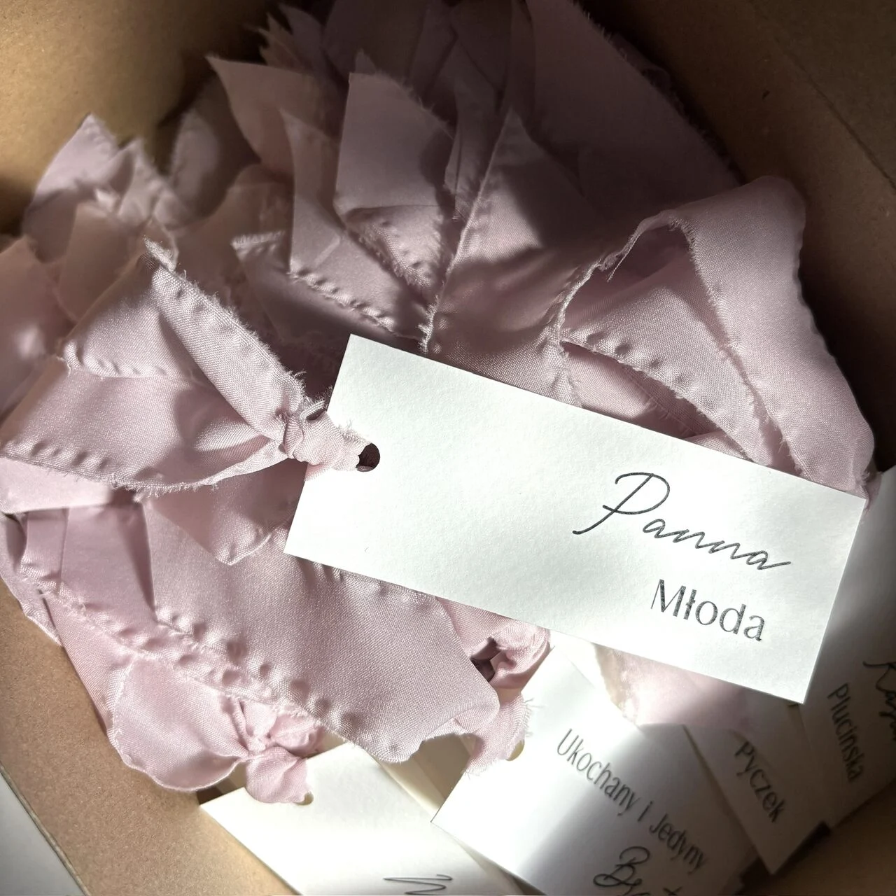 Subtelna i wyjątkowa winietka weselna ozdobiona ręcznie rwaną wstążką w odcieniu pudrowego różu. Połączenie wysokiej jakości papieru o delikatnej fakturze z miękką, postrzępioną tasiemką tworzy romantyczny, naturalny efekt, idealny do stylizacji boho, rustykalnych i klasycznych.